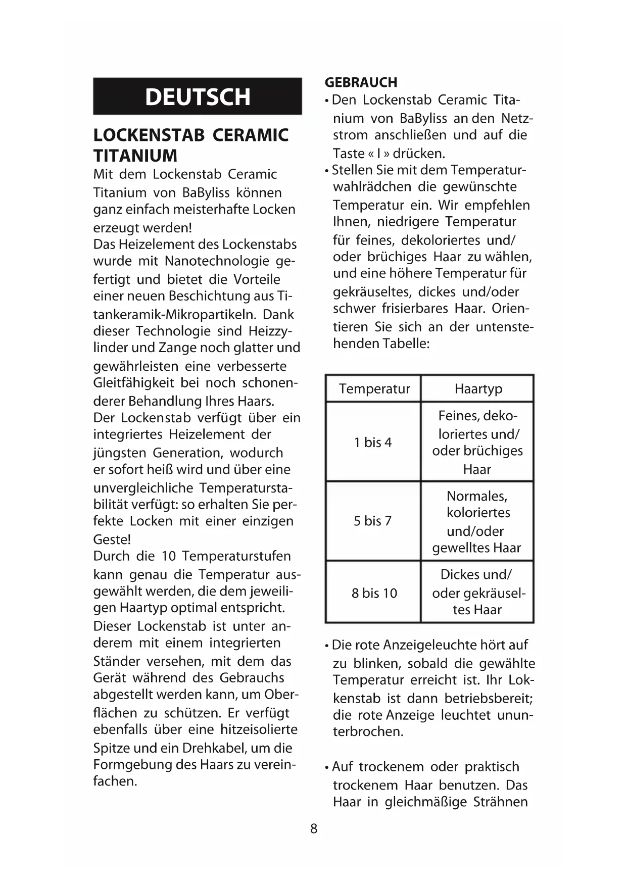 - Use the return and collection sys- tems available in your area. Some material can be recycled or recovered.8 DEUTSCH LOCKENSTAB CERAMIC TITANIUM Mit dem Lockenstab Ceramic Titanium von BaByliss können ganz einfach meisterhafte Locken erzeugt werden! Das Heizelement des Lockenstabs wurde mit Nanotechnologie ge- fertigt und bietet die Vorteile einer neuen Beschichtung aus Ti- tankeramik-Mikropartikeln. Dank dieser Technologie sind Heizzy- linder und Zange noch glatter und gewährleisten eine verbesserte Gleitfähigkeit bei noch schonen- derer Behandlung Ihres Haars. Der Lockenstab verfügt über ein integriertes Heizelement der jüngsten Generation, wodurch er sofort heiß wird und über eine unvergleichliche Temperatursta- bilität verfügt: so erhalten Sie per- fekte Locken mit einer einzigen Geste! Durch die 10 Temperaturstufen kann genau die Temperatur aus- gewählt werden, die dem jeweili- gen Haartyp optimal entspricht. Dieser Lockenstab ist unter an- derem mit einem integrierten Ständer versehen, mit dem das Gerät während des Gebrauchs abgestellt werden kann, um Ober- ächen zu schützen. Er verfügt ebenfalls über eine hitzeisolierte Spitze und ein Drehkabel, um die Formgebung des Haars zu verein- fachen. GEBRAUCH