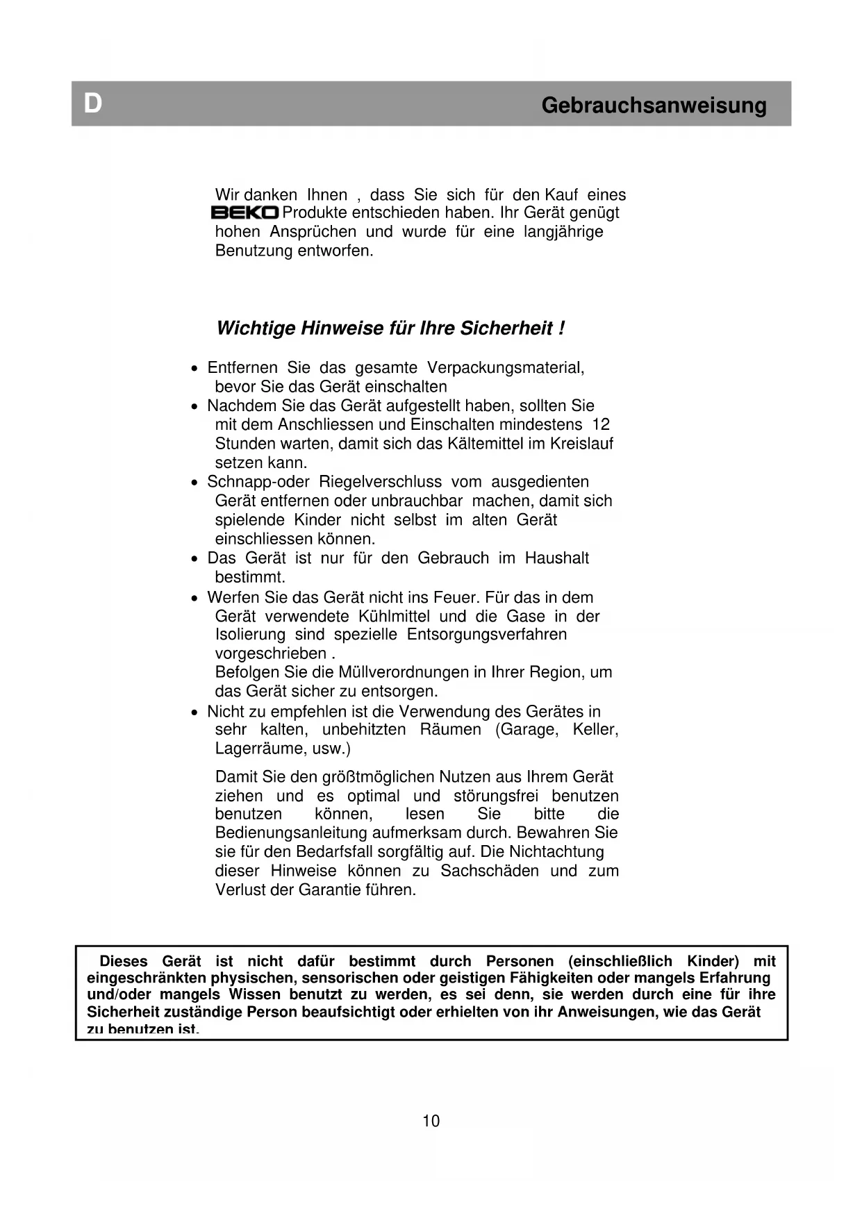 Dieses Gerät ist nicht dafür bestimmt durch Personen (einschließlich Kinder) mit