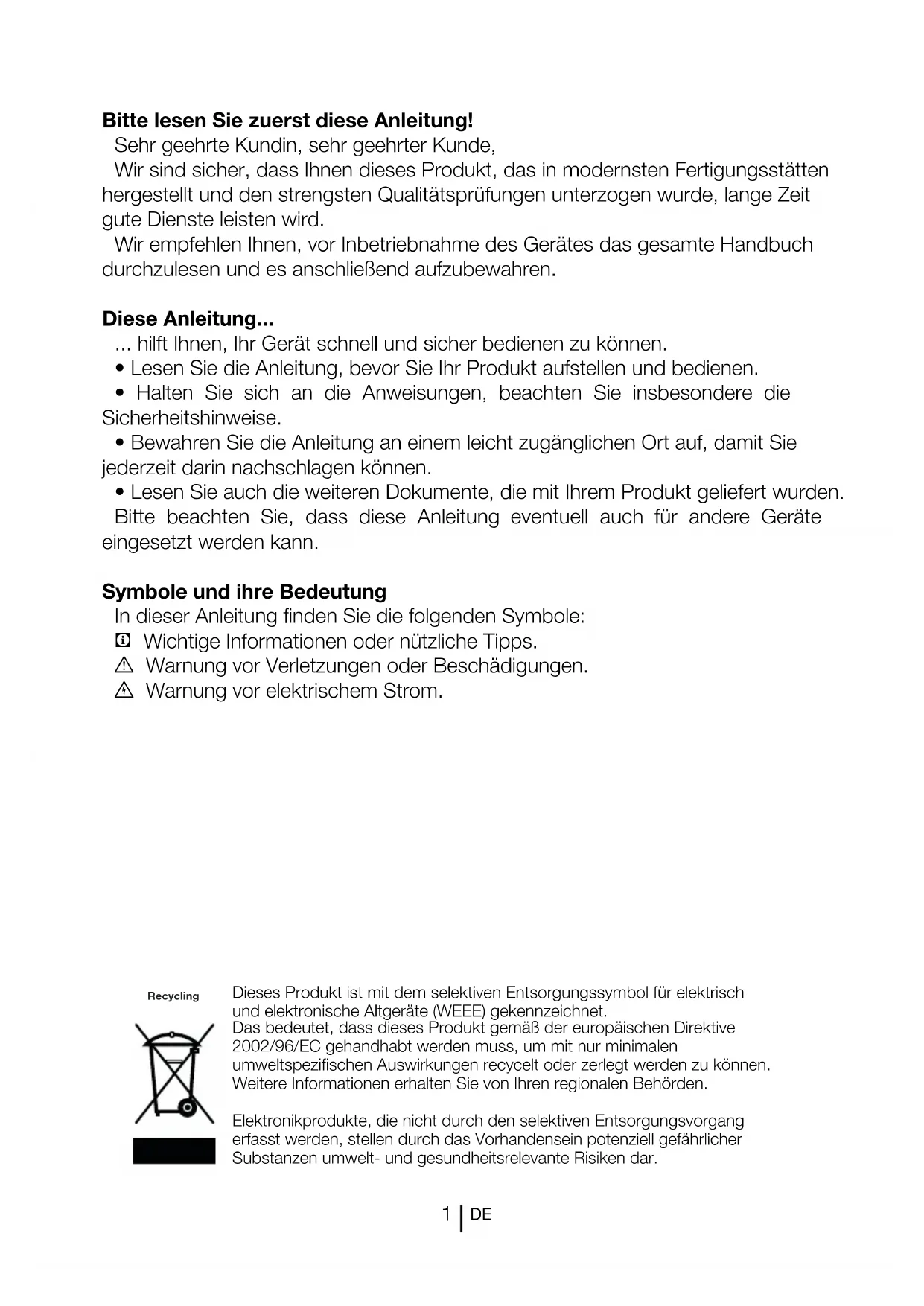 Wir empfehlen Ihnen, vor Inbetriebnahme des Gerätes das gesamte Handbuch