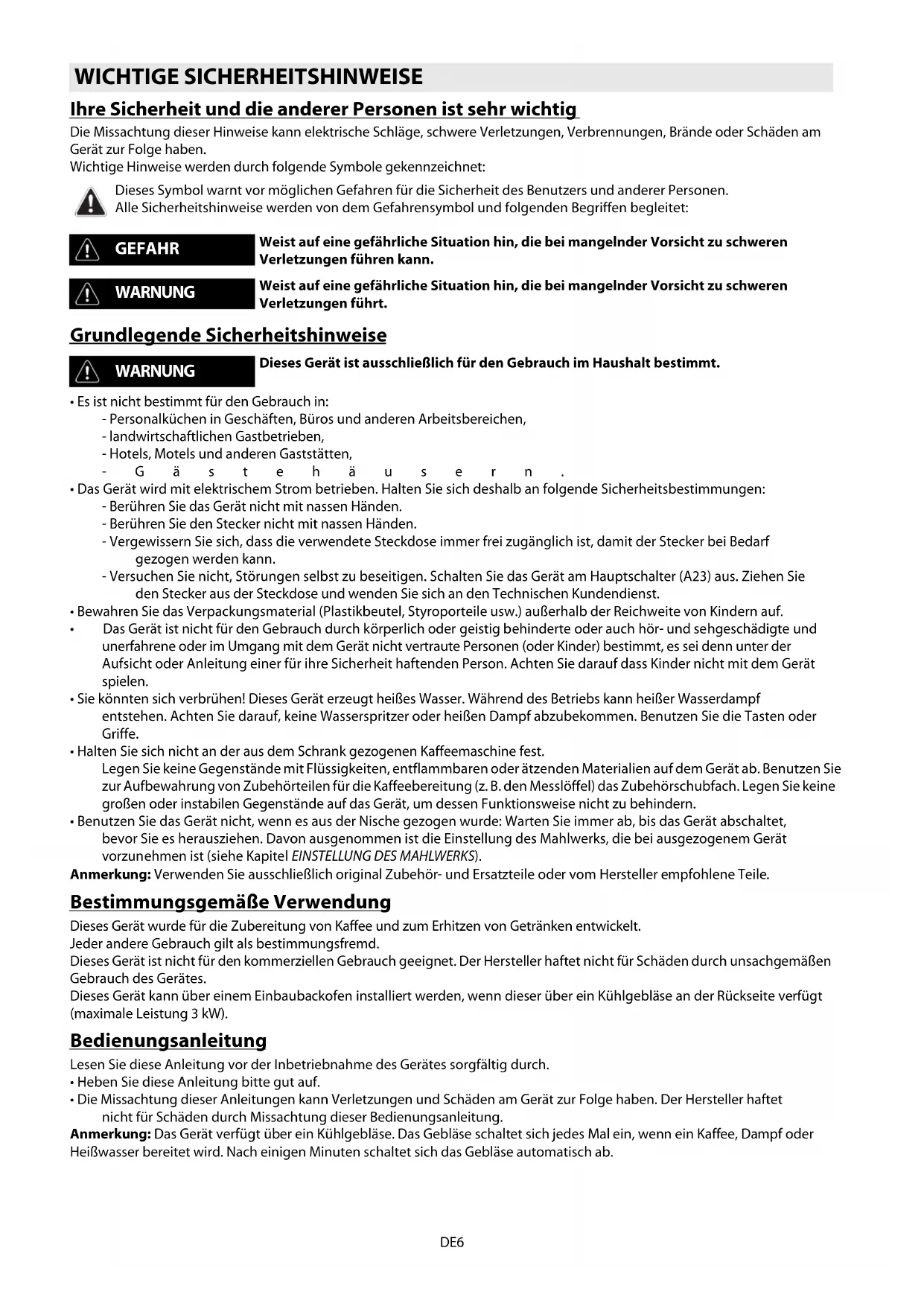 - Die Missachtung dieser Anleitungen kann Verletzungen und Schäden am Gerät zur Folge haben. Der Hersteller haftet nicht für Schäden durch Missachtung dieser Bedienungsanleitung. Anmerkung: Das Gerät verfügt über ein Kühlgebläse. Das Gebläse schaltet sich jedes Mal ein, wenn ein Kaffee, Dampf oder Heißwasser bereitet wird. Nach einigen Minuten schaltet sich das Gebläse automatisch ab. WICHTIGE SICHERHEITSHINWEISE Dieses Symbol warnt vor möglichen Gefahren für die Sicherheit des Benutzers und anderer Personen. Alle Sicherheitshinweise werden von dem Gefahrensymbol und folgenden Begriffen begleitet: GEFAHR Weist auf eine gefährliche Situation hin, die bei mangelnder Vorsicht zu schweren Verletzungen führen kann. WARNUNG Weist auf eine gefährliche Situation hin, die bei mangelnder Vorsicht zu schweren Verletzungen führt. WARNUNG Dieses Gerät ist ausschließlich für den Gebrauch im Haushalt bestimmt.DE7 Transportkontrolle Vergewissern Sie sich nach dem Auspacken, dass das Gerät unversehrt ist und alle Zubehörteile vorhanden sind. Verwenden Sie das Gerät nicht, wenn es offensichtlich beschädigt ist. Wenden Sie sich an den Technischen Kundendienst. Installation des Geräts Anschluss des Geräts Schließen Sie das Gerät nur an eine fachgerecht installierte Steckdose mit mindestens 10 A Ladung und korrekter Erdung an. Falls Stecker und Steckdose nicht vom selben Typ sind, lassen Sie die Steckdose durch eine Fachkraft gegen eine neue, passende auswechseln. Damit die Installation den geltenden Sicherheitsrichtlinien entspricht, ist bei der Installation ein allpoliger Sicherheitsschalter mit einer Kontaktöffnungsweite von mindestens 3 mm zu verwenden. Verwenden Sie keine Mehrfachstecker oder Verlängerungskabel. Dieses Gerät entspricht den folgenden EG-Richtlinien: