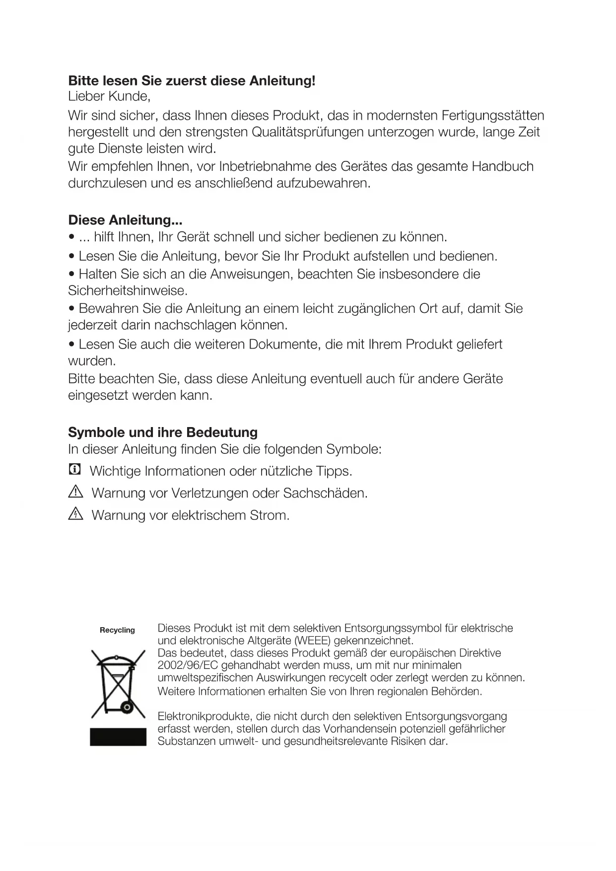 Wir empfehlen Ihnen, vor Inbetriebnahme des Gerätes das gesamte Handbuch