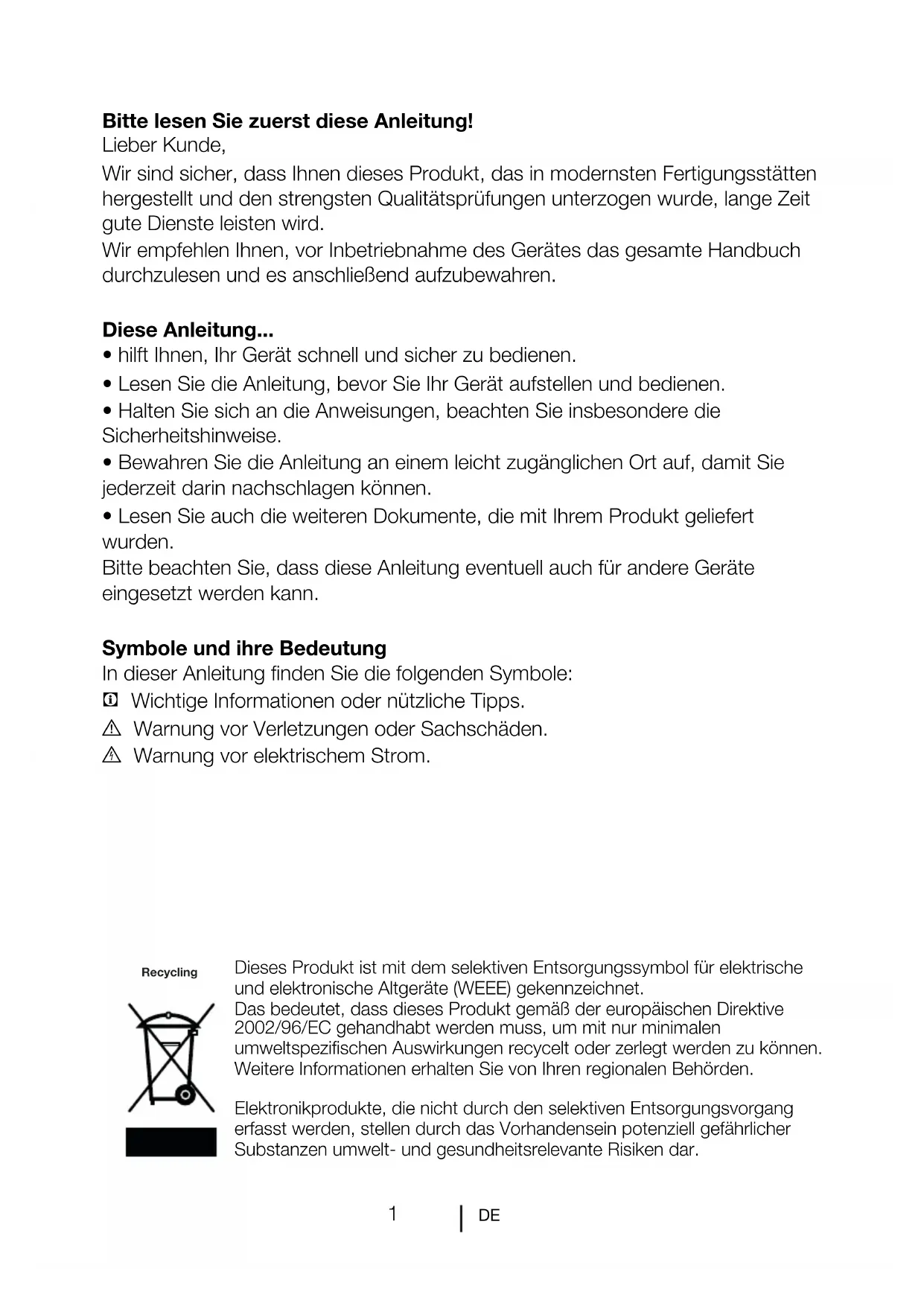 Wir empfehlen Ihnen, vor Inbetriebnahme des Gerätes das gesamte Handbuch