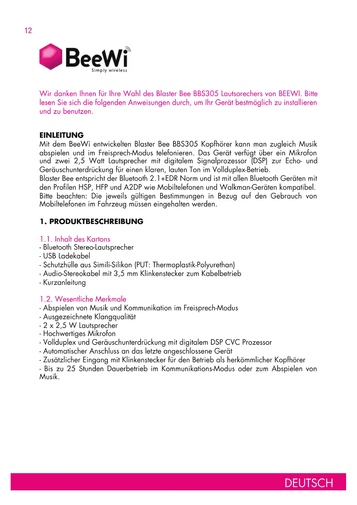 1.1. Inhalt des Kartons - Bluetooth Stereo-Lautsprecher - USB Ladekabel - Schutzhülle aus Simili-Silikon (PUT: Thermoplastik-Polyurethan) - Audio-Stereokabel mit 3,5 mm Klinkenstecker zum Kabelbetrieb - Kurzanleitung 1.2. Wesentliche Merkmale - Abspielen von Musik und Kommunikation im Freisprech-Modus - Ausgezeichnete Klangqualität - 2 x 2,5 W Lautsprecher - Hochwertiges Mikrofon - Vollduplex und Geräuschunterdrückung mit digitalem DSP CVC Prozessor - Automatischer Anschluss an das letzte angeschlossene Gerät - Zusätzlicher Eingang mit Klinkenstecker für den Betrieb als herkömmlicher Kopfhörer - Bis zu 25 Stunden Dauerbetrieb im Kommunikations-Modus oder zum Abspielen von Musik. Wir danken Ihnen für Ihre Wahl des Blaster Bee BBS305 Lautsorechers von BEEWI. Bitte lesen Sie sich die folgenden Anweisungen durch, um Ihr Gerät bestmöglich zu installieren und zu benutzen. DEUTSCH13 1.3. Produktvorstellung An/Aus: An/Aus-Knopf Ladekabelstecker (mit USB-Mikro kompatibel) 3,5mm Klinkenstecker: zusätzlicher Eingang mit Klinkenstecker Multifunktions-Taste, An und Pause Musik, Annahme von Anrufen, Pairing Leuchtanzeige Kontrolltaste für die Pisten & Lautstärke-Kontrolltaste VOL /VOL Mikrofon 1.4. Produktmerkmale