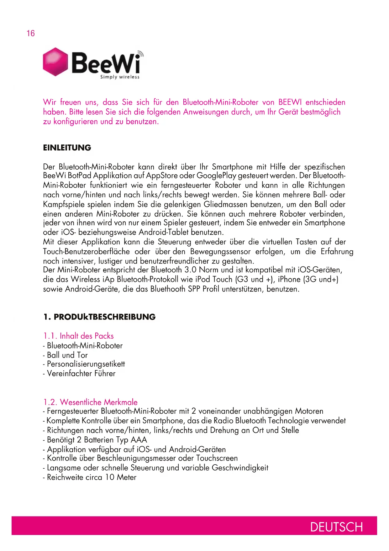 1.1. Inhalt des Packs - Bluetooth-Mini-Roboter - Ball und Tor - Personalisierungsetikett - Vereinfachter Führer 1.2. Wesentliche Merkmale - Ferngesteuerter Bluetooth-Mini-Roboter mit 2 voneinander unabhängigen Motoren - Komplette Kontrolle über ein Smartphone, das die Radio Bluetooth Technologie verwendet - Richtungen nach vorne/hinten, links/rechts und Drehung an Ort und Stelle - Benötigt 2 Batterien Typ AAA - Applikation verfügbar auf iOS- und Android-Geräten - Kontrolle über Beschleunigungsmesser oder Touchscreen - Langsame oder schnelle Steuerung und variable Geschwindigkeit - Reichweite circa 10 Meter Wir freuen uns, dass Sie sich für den Bluetooth-Mini-Roboter von BEEWI entschieden haben. Bitte lesen Sie sich die folgenden Anweisungen durch, um Ihr Gerät bestmöglich zu konfigurieren und zu benutzen. DEUTSCH17 DEUTSCH 1.3. Produktansicht Ein-/Ausschalter Leuchtanzeige Schwenkbare Gliedmassen Räder 1.4. Spécifications