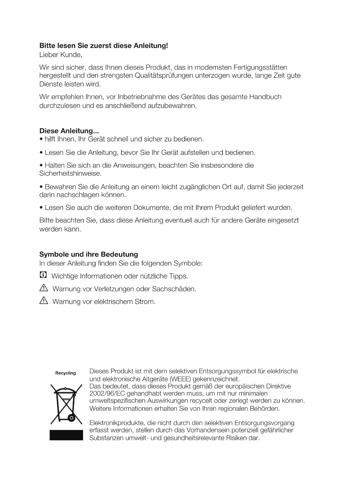 Wir empfehlen Ihnen, vor Inbetriebnahme des Gerätes das gesamte Handbuch