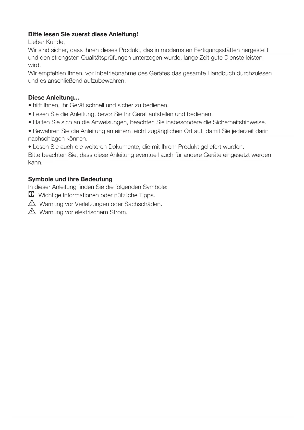 Wir empfehlen Ihnen, vor Inbetriebnahme des Gerätes das gesamte Handbuch durchzulesen