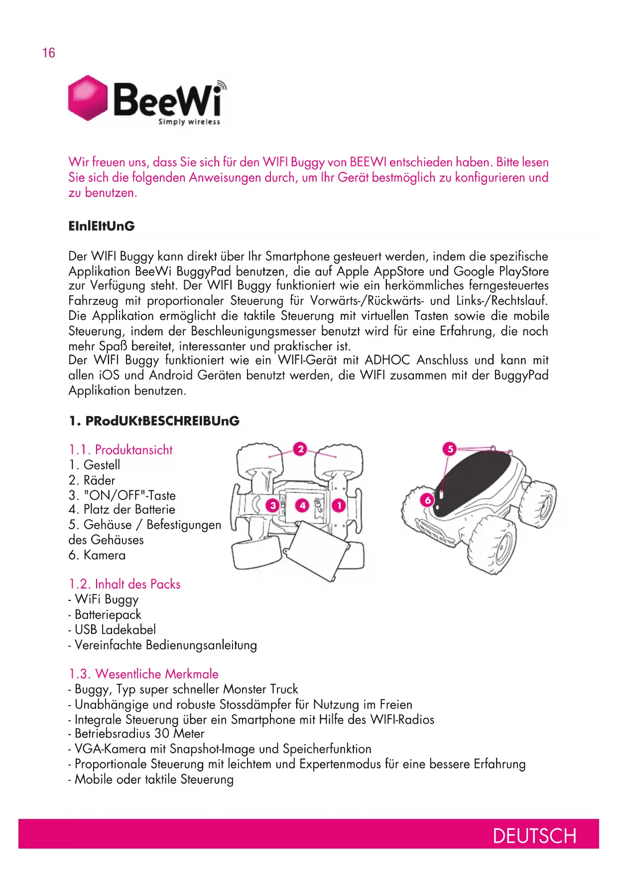 1.2. Inhalt des Packs - WiFi Buggy - Batteriepack - USB Ladekabel - Vereinfachte Bedienungsanleitung 1.3. Wesentliche Merkmale - Buggy, Typ super schneller Monster Truck - Unabhängige und robuste Stossdämpfer für Nutzung im Freien - Integrale Steuerung über ein Smartphone mit Hilfe des WIFI-Radios - Betriebsradius 30 Meter - VGA-Kamera mit Snapshot-Image und Speicherfunktion - Proportionale Steuerung mit leichtem und Expertenmodus für eine bessere Erfahrung - Mobile oder taktile Steuerung Wir freuen uns, dass Sie sich für den WIFI Buggy von BEEWI entschieden haben. Bitte lesen Sie sich die folgenden Anweisungen durch, um Ihr Gerät bestmöglich zu konfigurieren und zu benutzen.