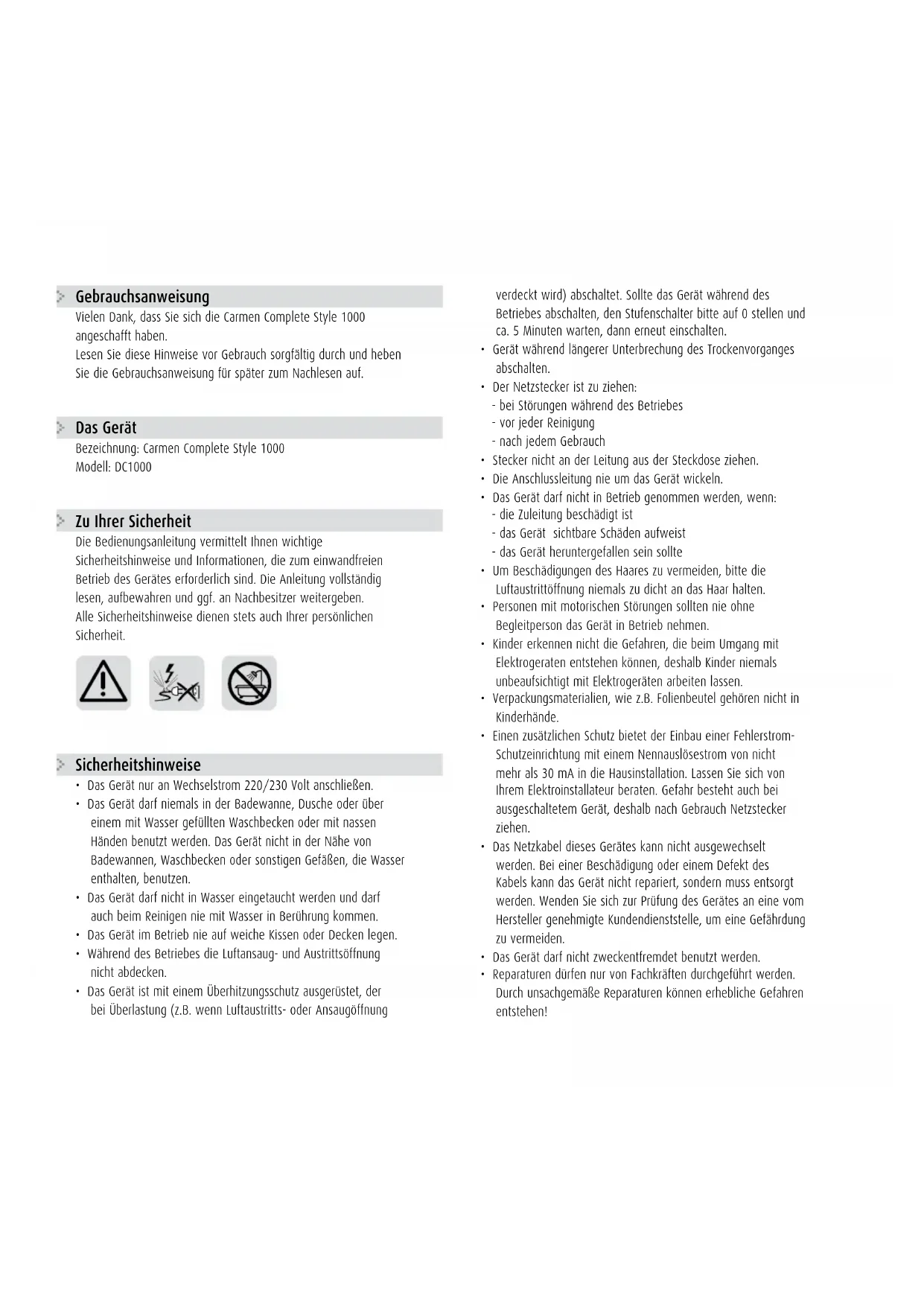 Vielen Dank, dass Sie sich die Carmen Complete Style 1000 angeschafft haben.