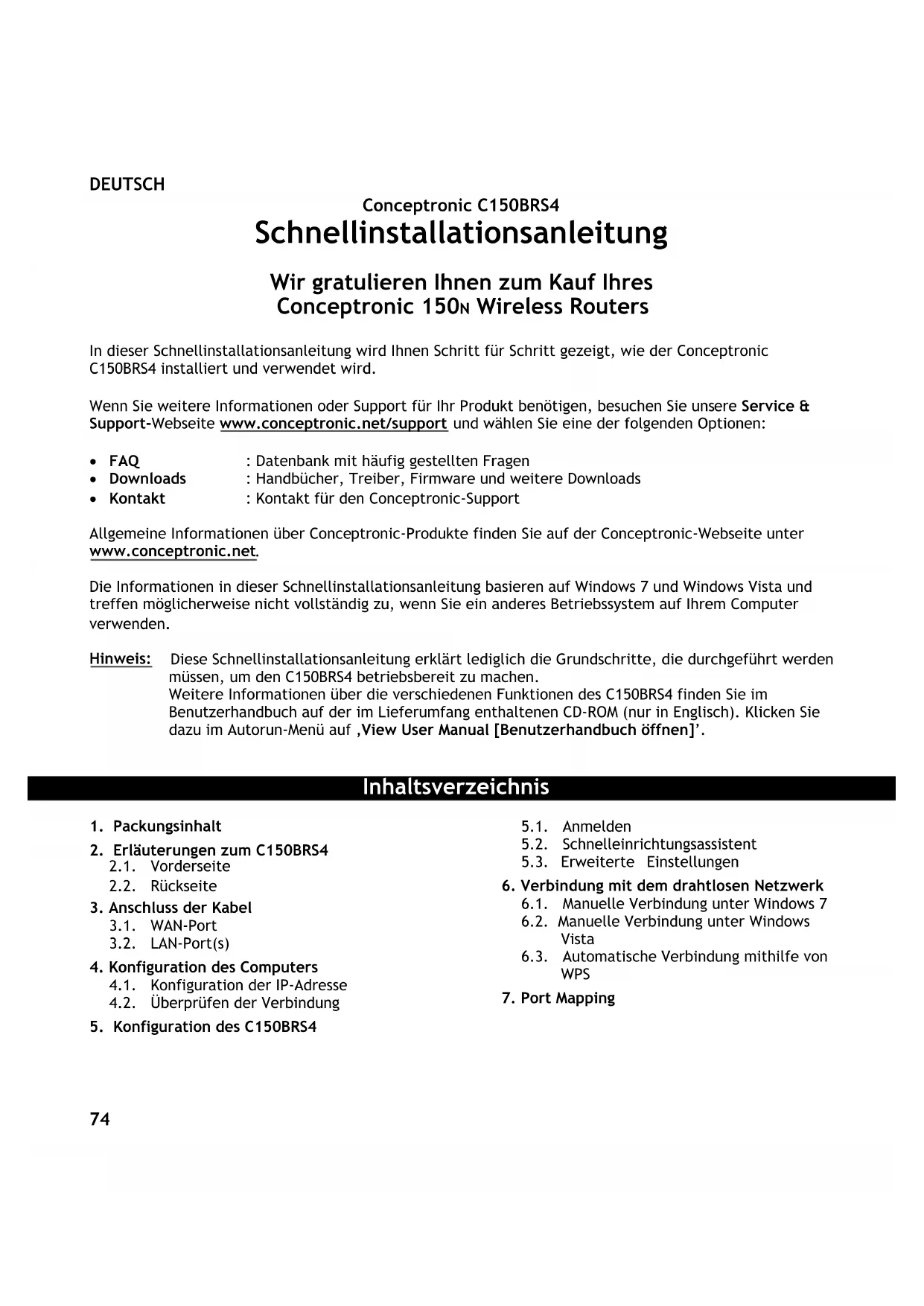 In dieser Schnellinstallationsanleitung wird Ihnen Schritt für Schritt gezeigt, wie der Conceptronic C150BRS4 installiert und verwendet wird.