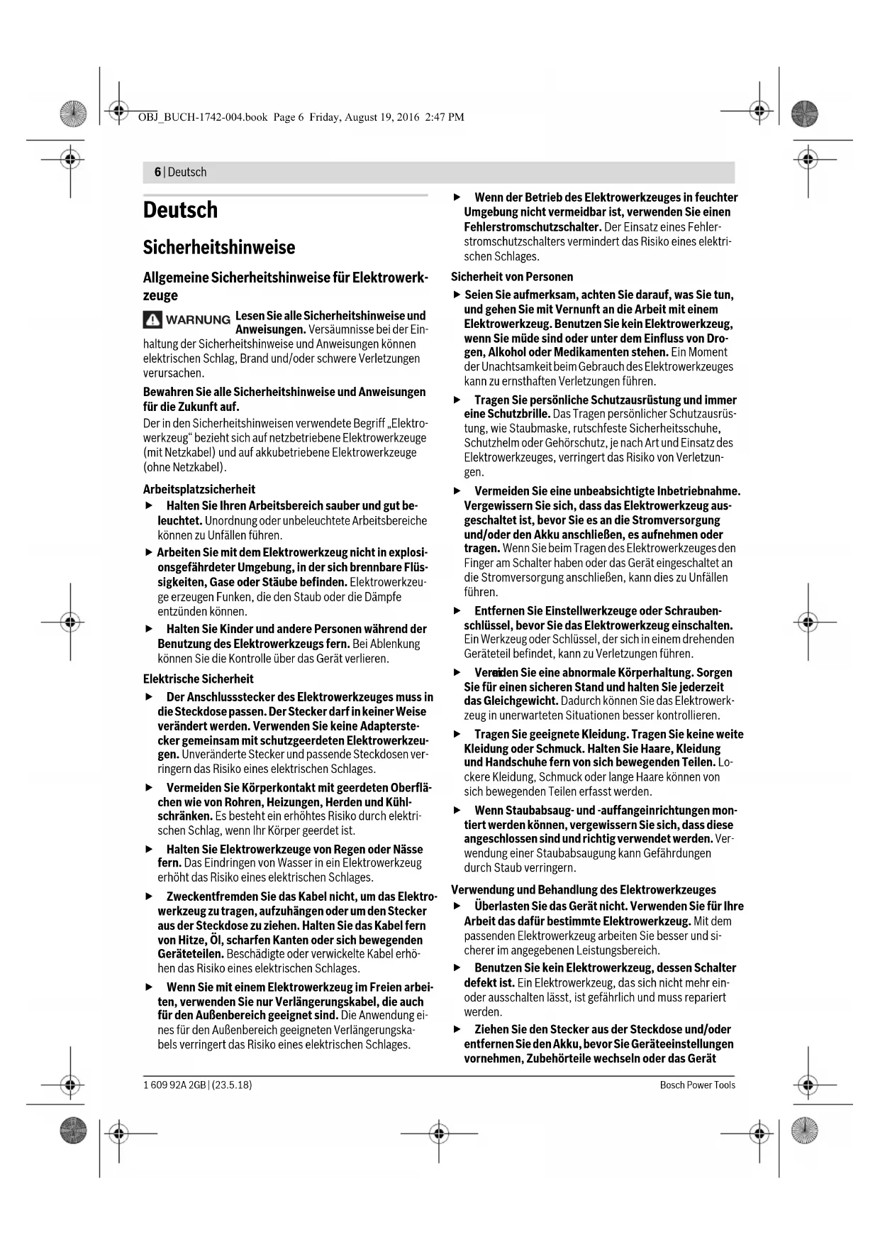 OBJ_BUCH-1742-004.book Page 5 Friday, August 19, 2016 2:47 PM6 | Deutsch 1 609 92A 2GB | (23.5.18) Bosch Power Tools Deutsch Sicherheitshinweise Allgemeine Sicherheitshinweise für Elektrowerk- zeuge Lesen Sie alle Sicherheitshinweise und Anweisungen. Versäumnisse bei der Ein- haltung der Sicherheitshinweise und Anweisungen können elektrischen Schlag, Brand und/oder schwere Verletzungen verursachen. Bewahren Sie alle Sicherheitshinweise und Anweisungen für die Zukunft auf. Der in den Sicherheitshinweisen verwendete Begriff „Elektro- werkzeug“ bezieht sich auf netzbetriebene Elektrowerkzeuge (mit Netzkabel) und auf akkubetriebene Elektrowerkzeuge (ohne Netzkabel). Arbeitsplatzsicherheit Halten Sie Ihren Arbeitsbereich sauber und gut be- leuchtet. Unordnung oder unbeleuchtete Arbeitsbereiche können zu Unfällen führen. Arbeiten Sie mit dem Elektrowerkzeug nicht in explosi- onsgefährdeter Umgebung, in der sich brennbare Flüs- sigkeiten, Gase oder Stäube befinden. Elektrowerkzeu- ge erzeugen Funken, die den Staub oder die Dämpfe entzünden können. Halten Sie Kinder und andere Personen während der Benutzung des Elektrowerkzeugs fern. Bei Ablenkung können Sie die Kontrolle über das Gerät verlieren. Elektrische Sicherheit Der Anschlussstecker des Elektrowerkzeuges muss in die Steckdose passen. Der Stecker darf in keiner Weise verändert werden. Verwenden Sie keine Adapterste- cker gemeinsam mit schutzgeerdeten Elektrowerkzeu- gen. Unveränderte Stecker und passende Steckdosen ver- ringern das Risiko eines elektrischen Schlages. Vermeiden Sie Körperkontakt mit geerdeten Oberflä- chen wie von Rohren, Heizungen, Herden und Kühl- schränken. Es besteht ein erhöhtes Risiko durch elektri- schen Schlag, wenn Ihr Körper geerdet ist. Halten Sie Elektrowerkzeuge von Regen oder Nässe fern. Das Eindringen von Wasser in ein Elektrowerkzeug erhöht das Risiko eines elektrischen Schlages. Zweckentfremden Sie das Kabel nicht, um das Elektro- werkzeug zu tragen, aufzuhängen oder um den Stecker aus der Steckdose zu ziehen. Halten Sie das Kabel fern von Hitze, Öl, scharfen Kanten oder sich bewegenden Geräteteilen. Beschädigte oder verwickelte Kabel erhö- hen das Risiko eines elektrischen Schlages. Wenn Sie mit einem Elektrowerkzeug im Freien arbei- ten, verwenden Sie nur Verlängerungskabel, die auch für den Außenbereich geeignet sind. Die Anwendung ei- nes für den Außenbereich geeigneten Verlängerungska- bels verringert das Risiko eines elektrischen Schlages. Wenn der Betrieb des Elektrowerkzeuges in feuchter Umgebung nicht vermeidbar ist, verwenden Sie einen Fehlerstromschutzschalter. Der Einsatz eines Fehler- stromschutzschalters vermindert das Risiko eines elektri- schen Schlages. Sicherheit von Personen Seien Sie aufmerksam, achten Sie darauf, was Sie tun, und gehen Sie mit Vernunft an die Arbeit mit einem Elektrowerkzeug. Benutzen Sie kein Elektrowerkzeug, wenn Sie müde sind oder unter dem Einfluss von Dro- gen, Alkohol oder Medikamenten stehen. Ein Moment der Unachtsamkeit beim Gebrauch des Elektrowerkzeuges kann zu ernsthaften Verletzungen führen. Tragen Sie persönliche Schutzausrüstung und immer eine Schutzbrille. Das Tragen persönlicher Schutzausrüs- tung, wie Staubmaske, rutschfeste Sicherheitsschuhe, Schutzhelm oder Gehörschutz, je nach Art und Einsatz des Elektrowerkzeuges, verringert das Risiko von Verletzun- gen. Vermeiden Sie eine unbeabsichtigte Inbetriebnahme. Vergewissern Sie sich, dass das Elektrowerkzeug aus- geschaltet ist, bevor Sie es an die Stromversorgung und/oder den Akku anschließen, es aufnehmen oder tragen. Wenn Sie beim Tragen des Elektrowerkzeuges den Finger am Schalter haben oder das Gerät eingeschaltet an die Stromversorgung anschließen, kann dies zu Unfällen führen. Entfernen Sie Einstellwerkzeuge oder Schrauben- schlüssel, bevor Sie das Elektrowerkzeug einschalten. Ein Werkzeug oder Schlüssel, der sich in einem drehenden Geräteteil befindet, kann zu Verletzungen führen. Verm