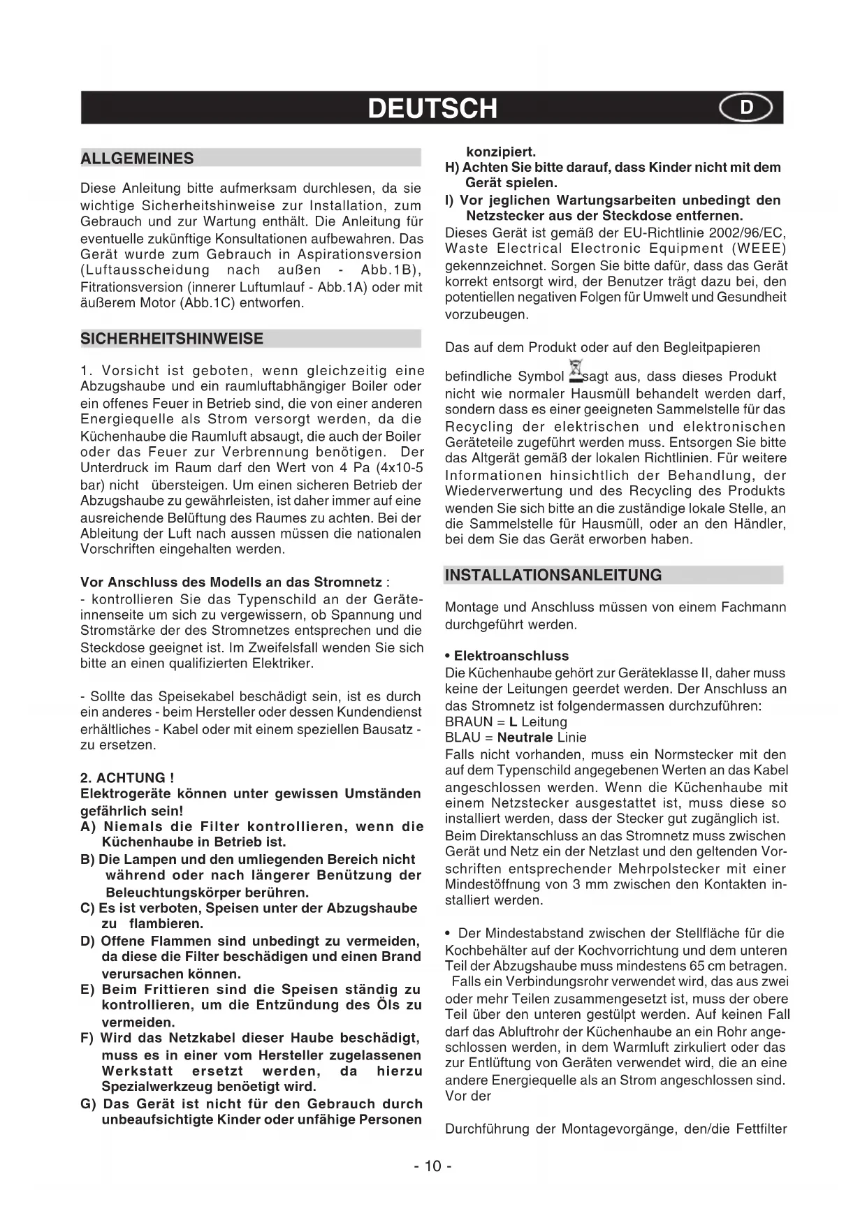 Abzugshaube und ein raumluftabhängiger Boiler oder ein offenes Feuer in Betrieb sind, die von einer anderen Energiequelle als Strom versorgt werden, da die Küchenhaube die Raumluft absaugt, die auch der Boiler oder das Feuer zur Verbrennung benötigen. Der Unterdruck im Raum darf den Wert von 4 Pa (4x10-5 bar) nicht übersteigen. Um einen sicheren Betrieb der Abzugshaube zu gewährleisten, ist daher immer auf eine ausreichende Belüftung des Raumes zu achten. Bei der Ableitung der Luft nach aussen müssen die nationalen Vorschriften eingehalten werden. Vor Anschluss des Modells an das Stromnetz : - kontrollieren Sie das Typenschild an der Geräte- innenseite um sich zu vergewissern, ob Spannung und Stromstärke der des Stromnetzes entsprechen und die Steckdose geeignet ist. Im Zweifelsfall wenden Sie sich bitte an einen qualifizierten Elektriker. - Sollte das Speisekabel beschädigt sein, ist es durch ein anderes - beim Hersteller oder dessen Kundendienst erhältliches - Kabel oder mit einem speziellen Bausatz - zu ersetzen.