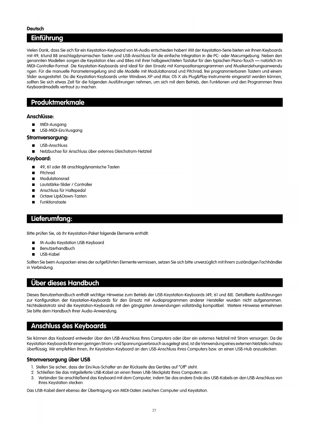 - Messages Sys Ex ** Messages MMC Sys Ex *** Cette valeur ne peut être tapée à l’aide des touches du clavier numérique. Tapez 144 puis appuyer sur le bouton préréglé + afin de régler cette valeur.2627 Einführung Vielen Dank, dass Sie sich für ein Keystation-Keyboard von M-Audio entschieden haben! Mit der Keystation-Serie bieten wir Ihnen Keyboards mit 49, 61und 88 anschlagdynamischen Tasten und USB-Anschluss für die einfache Integration in die PC- oder Macumgebung. Neben den genannten Modellen sorgen die Keystation 61es und 88es mit ihrer halbgewichteten Tastatur für den typischen Piano-Touch — natürlich im MIDI-Controller-Format. Die Keystation-Keyboards sind ideal für den Einsatz mit Kompositionsprogrammen und Musikerziehungsanwendu ngen. Für die manuelle Parameterregelung sind alle Modelle mit Modulationsrad und Pitchrad, frei programmierbaren Tastern und einem Slider ausgestattet. Da die Keystation-Keyboards unter Windows XP und Mac OS X als Plug&Play-Instrumente eingesetzt werden können, sollten Sie sich etwas Zeit für die folgenden Ausführungen nehmen, um sich mit dem Betrieb, den Funktionen und den Programmen Ihres Keyboardmodells vertraut zu machen. Produktmerkmale Anschlüsse: < MIDI-Ausgang < USB-MIDI-Ein/Ausgang Stromversorgung: < USB-Anschluss < Netzbuchse für Anschluss über externes Gleichstrom-Netzteil Keyboard: < 49, 61 oder 88 anschlagdynamische Tasten < Pitchrad < Modulationsrad < Lautstärke-Slider / Controller < Anschluss für Haltepedal < Octave Up&Down-Tasten < Funktionstaste Lieferumfang: Bitte prüfen Sie, ob Ihr Keystation-Paket folgende Elemente enthält: < M-Audio Keystation USB-Keyboard < Benutzerhandbuch < USB-Kabel Sollten Sie beim Auspacken eines der aufgeführten Elemente vermissen, setzen Sie sich bitte unverzüglich mit Ihrem zuständigen Fachhändler in Verbindung. Über dieses Handbuch Dieses Benutzerhandbuch enthält wichtige Hinweise zum Betrieb der USB-Keystation-Keyboards (49, 61 und 88). Detaillierte Ausführungen zur Konfiguration der Keystation-Keyboards für den Einsatz mit Audioprogrammen anderer Hersteller wurden nicht aufgenommen. Nichtsdestotrotz sind die Keystation-Keyboards mit den gängigsten Anwendungen vollständig kompatibel. Weitere Hinweise entnehmen Sie bitte dem Handbuch Ihrer Audio-Anwendung. Anschluss des Keyboards Sie können das Keyboard entweder über den USB-Anschluss Ihres Computers oder über ein externes Netzteil mit Strom versorgen. Da die Keystation-Keyboards für einen geringen Strom- und Spannungsverbrauch ausgelegt sind, ist die Verwendung eines externen Netzteils nahezu überflüssig. Wir empfehlen Ihnen, Ihr Keystation-Keyboard an den USB-Anschluss Ihres Computers bzw. an einen USB-Hub anzustecken. Stromversorgung über USB