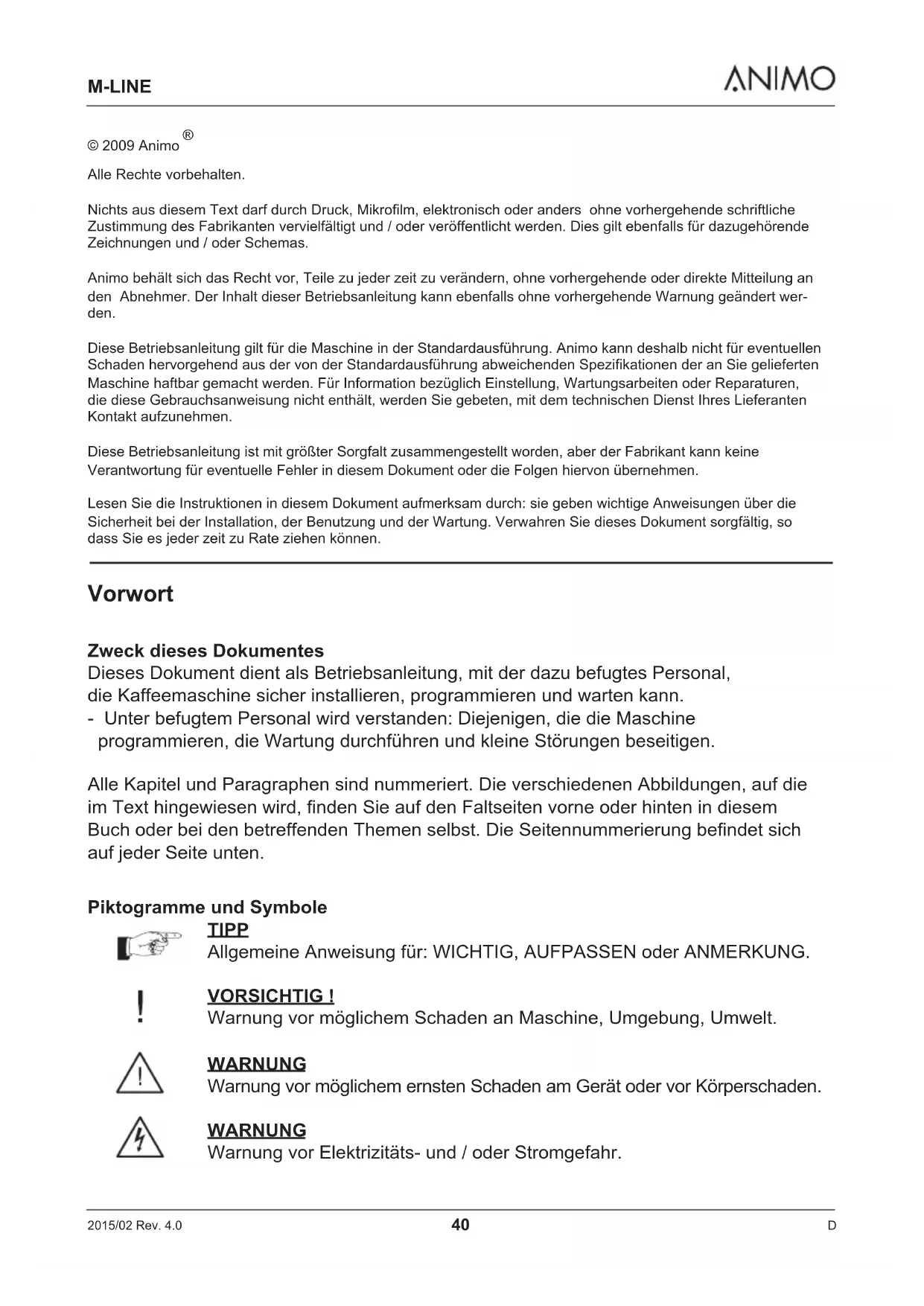 Alle Rechte vorbehalten. Nichts aus diesem Text darf durch Druck, Mikrofilm, elektronisch oder anders ohne vorhergehende schriftliche Zustimmung des Fabrikanten vervielfältigt und / oder veröffentlicht werden. Dies gilt ebenfalls für dazugehörende Zeichnungen und / oder Schemas. Animo behält sich das Recht vor, Teile zu jeder zeit zu verändern, ohne vorhergehende oder direkte Mitteilung an den Abnehmer. Der Inhalt dieser Betriebsanleitung kann ebenfalls ohne vorhergehende Warnung geändert wer- den. Diese Betriebsanleitung gilt für die Maschine in der Standardausführung. Animo kann deshalb nicht für eventuellen Schaden hervorgehend aus der von der Standardausführung abweichenden Spezifikationen der an Sie gelieferten Maschine haftbar gemacht werden. Für Information bezüglich Einstellung, Wartungsarbeiten oder Reparaturen, die diese Gebrauchsanweisung nicht enthält, werden Sie gebeten, mit dem technischen Dienst Ihres Lieferanten Kontakt aufzunehmen. Diese Betriebsanleitung ist mit größter Sorgfalt zusammengestellt worden, aber der Fabrikant kann keine Verantwortung für eventuelle Fehler in diesem Dokument oder die Folgen hiervon übernehmen. Lesen Sie die Instruktionen in diesem Dokument aufmerksam durch: sie geben wichtige Anweisungen über die Sicherheit bei der Installation, der Benutzung und der Wartung. Verwahren Sie dieses Dokument sorgfältig, so dass Sie es jeder zeit zu Rate ziehen können. Vorwort Zweck dieses Dokumentes Dieses Dokument dient als Betriebsanleitung, mit der dazu befugtes Personal, die Kaffeemaschine sicher installieren, programmieren und warten kann. - Unter befugtem Personal wird verstanden: Diejenigen, die die Maschine programmieren, die Wartung durchführen und kleine Störungen beseitigen. Alle Kapitel und Paragraphen sind nummeriert. Die verschiedenen Abbildungen, auf die im Text hingewiesen wird, finden Sie auf den Faltseiten vorne oder hinten in diesem Buch oder bei den betreffenden Themen selbst. Die Seitennummerierung befindet sich auf jeder Seite unten. Piktogramme und Symbole TIPP Allgemeine Anweisung für: WICHTIG, AUFPASSEN oder ANMERKUNG. VORSICHTIG ! Warnung vor möglichem Schaden an Maschine, Umgebung, Umwelt. WARNUNG Warnung vor möglichem ernsten Schaden am Gerät oder vor Körperschaden. WARNUNG Warnung vor Elektrizitäts- und / oder Stromgefahr.2015/02 Rev. 4.0 M-LINE