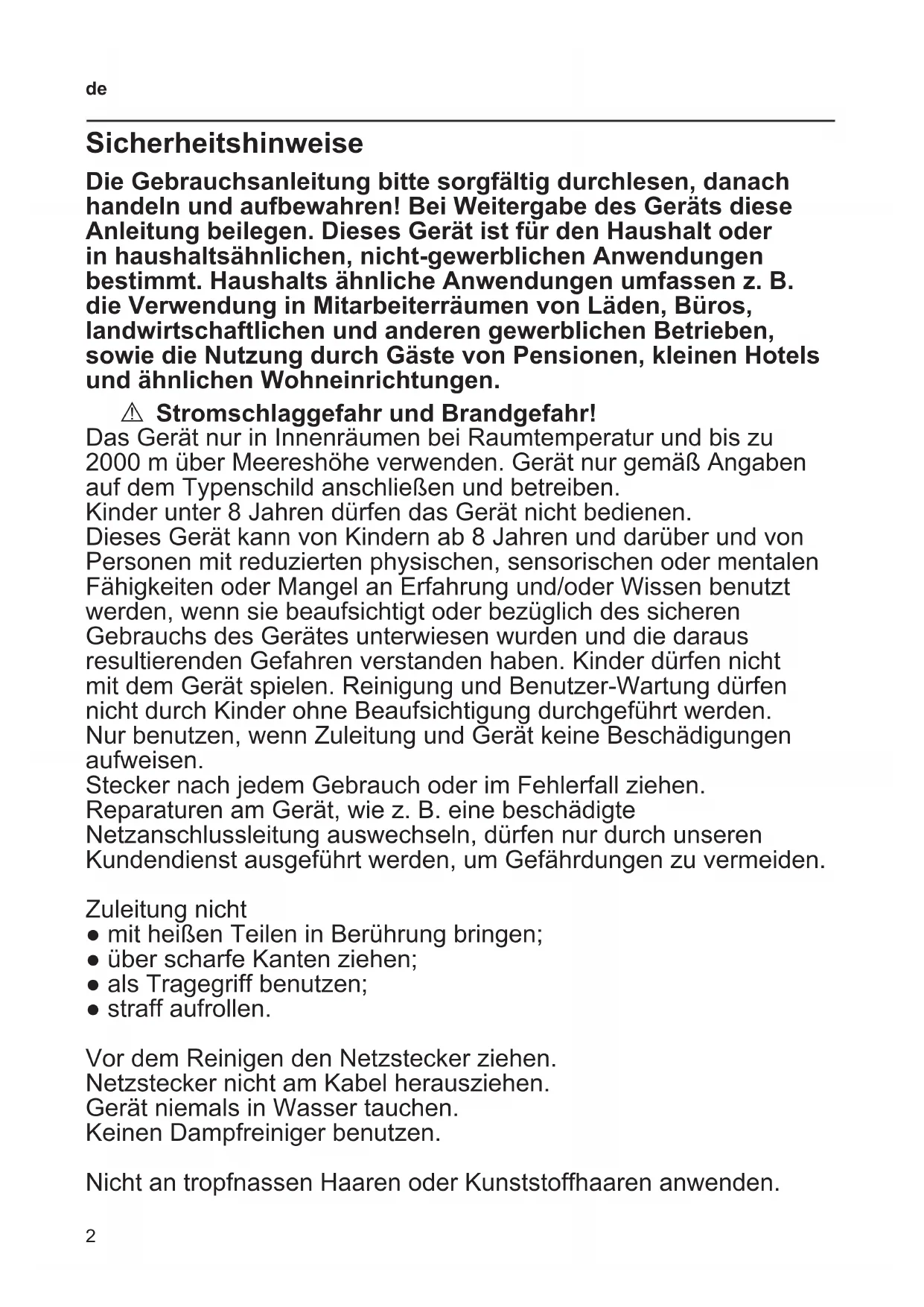 Sicherheitshinweise Die Gebrauchsanleitung bitte sorgfältig durchlesen, danach handeln und aufbewahren! Bei Weitergabe des Geräts diese Anleitung beilegen. Dieses Gerät ist für den Haushalt oder in haushaltsähnlichen, nicht-gewerblichen Anwendungen bestimmt. Haushalts ähnliche Anwendungen umfassen z. B. die Verwendung in Mitarbeiterräumen von Läden, Büros, landwirtschaftlichen und anderen gewerblichen Betrieben, sowie die Nutzung durch Gäste von Pensionen, kleinen Hotels und ähnlichen Wohneinrichtungen. A Stromschlaggefahr und Brandgefahr! Das Gerät nur in Innenräumen bei Raumtemperatur und bis zu 2000 m über Meereshöhe verwenden. Gerät nur gemäß Angaben auf dem Typenschild anschließen und betreiben. Kinder unter 8 Jahren dürfen das Gerät nicht bedienen. Dieses Gerät kann von Kindern ab 8 Jahren und darüber und von Personen mit reduzierten physischen, sensorischen oder mentalen Fähigkeiten oder Mangel an Erfahrung und/oder Wissen benutzt werden, wenn sie beaufsichtigt oder bezüglich des sicheren Gebrauchs des Gerätes unterwiesen wurden und die daraus resultierenden Gefahren verstanden haben. Kinder dürfen nicht mit dem Gerät spielen. Reinigung und Benutzer-Wartung dürfen nicht durch Kinder ohne Beaufsichtigung durchgeführt werden. Nur benutzen, wenn Zuleitung und Gerät keine Beschädigungen aufweisen. Stecker nach jedem Gebrauch oder im Fehlerfall ziehen. Reparaturen am Gerät, wie z. B. eine beschädigte Netzanschlussleitung auswechseln, dürfen nur durch unseren Kundendienst ausgeführt werden, um Gefährdungen zu vermeiden. Zuleitung nicht ● mit heißen Teilen in Berührung bringen; ● über scharfe Kanten ziehen; ● als Tragegriff benutzen; ● straff aufrollen. Vor dem Reinigen den Netzstecker ziehen. Netzstecker nicht am Kabel herausziehen. Gerät niemals in Wasser tauchen. Keinen Dampfreiniger benutzen. Nicht an tropfnassen Haaren oder Kunststoffhaaren anwenden.3