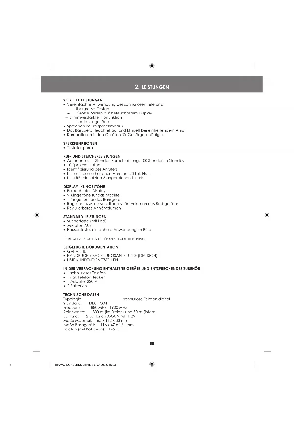- 2 Batterien TECHNISCHE DATEN Typologie: schnurlose Telefon digital Standard: DECT GAP Frequenz: 1880 MHz - 1900 MHz Reichweite: 300 m (im Freien) und 50 m (intern) Batterie: 2 Batterien AAA NiMH 1,2V Maße Mobilteil: 65 x 162 x 33 mm Maße Basisgerät: 116 x 47 x 121 mm Telefon (mit Batterien): 146 g BRAVO CORDLESS-2-lingue 6-09-2005, 16:035859