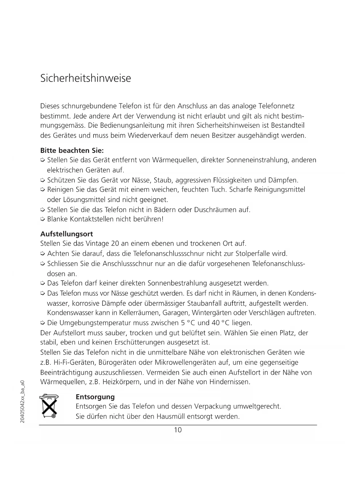 tion cord into the wall socket using the corresponding adaptor.8 20405042xx_ba_a0 Telephoning Accepting a call When an external call arrives, the telephone starts ringing. Lift the handset to accept the call. At the end of the call, replace the handset. Making a call Lift the handset, wait for dial tone and dial the desired number. At the end of the call, replace the handset. Redial the last-dialled number The last-dialled number is stored in a temporary memory which is actualised each time you dial a new number. To redial the last-dialled number, press the center key. Insert dialling pauses When dialling a telephone number, you can insert a dialling pause between two digits by pressing the center key. The dialling pause is stored in the redial memory together with the number. If you redial this number, the pause will automatically be redialled.9 20405042xx_ba_a0 English General information Approval and conformity This corded analogue telephone complies with the basic requirements contained in the R&TTE Directive 1999/5/EC on radio equipment and telecommunications terminal equip- ment and is suitable for connection and operation in the member state indicated on the telephone and/or packaging. The declaration of conformity may be viewed at the end of this manual. The CE symbol confirms the conformity of the telephone with the above directive. Warranty conditions Your telephone is subject to a guarantee from the date of purchase in accordance with the legal provisions of the country in which the telephone was purchased. As evidence of the date of purchase, please keep the receipt or the warranty card completed by the retailer. All defects attributable to material and manufacturing faults will be corrected free of charge within the warranty period, either by repairing or replacing the defective equipment. The warranty does not cover expendable materials, defects which affect the value or use of the equipment only insignificantly, and damage caused by incorrect use, ordinary wear and tear, or manipulation by third parties. This warranty does not cover consequential damage caused by the use, failure or defectiveness of the product. In particular, no liability whatsoever is accepted for damage to property and pecuniary loss. To claim under this warranty, please contact the retailer where you purchased your tele- phone.10 20405042xx_ba_a0 Sicherheitshinweise Dieses schnurgebundene Telefon ist für den Anschluss an das analoge Telefonnetz bestimmt. Jede andere Art der Verwendung ist nicht erlaubt und gilt als nicht bestim- mungsgemäss. Die Bedienungsanleitung mit ihren Sicherheitshinweisen ist Bestandteil des Gerätes und muss beim Wiederverkauf dem neuen Besitzer ausgehändigt werden. Bitte beachten Sie: ➭ Stellen Sie das Gerät entfernt von Wärmequellen, direkter Sonneneinstrahlung, anderen elektrischen Geräten auf. ➭ Schützen Sie das Gerät vor Nässe, Staub, aggressiven Flüssigkeiten und Dämpfen. ➭ Reinigen Sie das Gerät mit einem weichen, feuchten Tuch. Scharfe Reinigungsmittel oder Lösungsmittel sind nicht geeignet. ➭ Stellen Sie die das Telefon nicht in Bädern oder Duschräumen auf. ➭ Blanke Kontaktstellen nicht berühren! Aufstellungsort Stellen Sie das Vintage 20 an einem ebenen und trockenen Ort auf. ➭ Achten Sie darauf, dass die Telefonanschlussschnur nicht zur Stolperfalle wird. ➭ Schliessen Sie die Anschlussschnur nur an die dafür vorgesehenen Telefonanschluss- dosen an. ➭ Das Telefon darf keiner direkten Sonnenbestrahlung ausgesetzt werden. ➭ Das Telefon muss vor Nässe geschützt werden. Es darf nicht in Räumen, in denen Kondens- wasser, korrosive Dämpfe oder übermässiger Staubanfall auftritt, aufgestellt werden. Kondenswasser kann in Kellerräumen, Garagen, Wintergärten oder Verschlägen auftreten. ➭ Die Umgebungstemperatur muss zwischen 5 °C und 40 °C liegen. Der Aufstellort muss sauber, trocken und gut belüftet sein. Wählen Sie einen Platz, der stabil, eben und keinen Erschütterungen ausgesetzt ist. Stellen Sie das Telefon nicht in die unmittelbare Nähe von elektronischen Geräten wie z.B. Hi-Fi-Geräten, Bürogeräten oder Mikrowellengeräten auf, um eine gegenseitige Beeinträchtigung auszuschliessen. Vermeiden Sie auch einen Aufstellort in der Nähe von Wärmequellen, z.B. Heizkörpern, und in der Nähe von Hindernissen. Entsorgung Entsorgen Sie das Telefon und dessen Verpackung umweltgerecht. Sie dürfen nicht über den Hausmüll entsorgt werden.11 20405042xx_ba_a0 Deutsch Telefon in Betrieb nehmen Verpackungsinhalt ➭ 1 Telefon Vintage 20 ➭ 1 Telefonhörer mit Hörerschnur ➭ 1 Netzkabel ➭ 1 Bedienungsanleitung Gesamtansicht Die wichtigsten Funktionen ➭ Wahlwiederholung der zuletzt gewählten Nummer ➭ Einfügen von automatischen Wahlpausen ➭ Klingellautstärke auf 2 Stufen einstellbar (laut oder leise) ➭ Wahlmodus auf Ton- oder Impulswahl einstellbar Schalter zum Einstellen des Wahlmodus (auf der Rückseite) Anschluss für Hörerschnur (auf der Rückseite) Taste Wahlwieder- holung der zuletzt gewählten Nummer und zum Einfügen von Wahlpausen Schalter zum Ein- stellen der Klingel- lautstärke (auf der Rückseite) Anschluss für Netz- kabel (auf der Rück- seite)12 20405042xx_ba_a0 Telefon in Betrieb nehmen Telefon anschliessen Klingellautstärke Mittels des Schalters RINGER auf der Rückseite des Telefons können Sie die Klingellaut- stärke auf 2 Stufen einstellen: Laut: HI Leise: LOW Wahlmodus Sie können Ihr Vintage 20 auf Ton- oder Impulswahl einstellen. Wenden Sie sich an Ihren Netzanbieter für weitere Infomationen. Stellen Sie den Schalter auf PULSE, wenn Sie Impulswahl einstellen möchten. Stellen Sie den Schalter auf TONE , wenn Sie Tonwahl einstellen möchten.