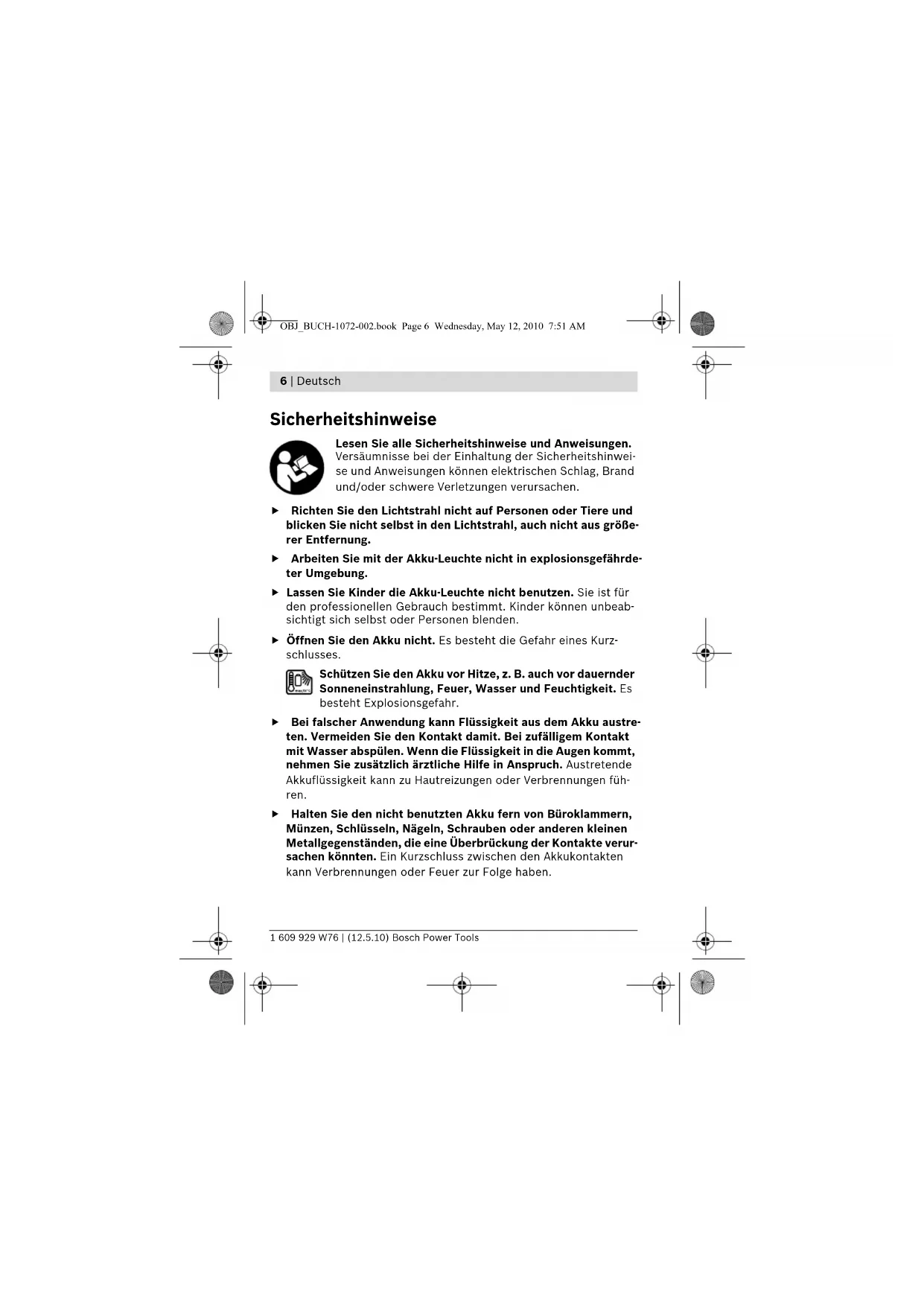 Sicherheitshinweise Lesen Sie alle Sicherheitshinweise und Anweisungen. Versäumnisse bei der Einhaltung der Sicherheitshinwei- se und Anweisungen können elektrischen Schlag, Brand und/oder schwere Verletzungen verursachen. f Richten Sie den Lichtstrahl nicht auf Personen oder Tiere und blicken Sie nicht selbst in den Lichtstrahl, auch nicht aus größe- rer Entfernung. f Arbeiten Sie mit der Akku-Leuchte nicht in explosionsgefährde- ter Umgebung. f Lassen Sie Kinder die Akku-Leuchte nicht benutzen. Sie ist für den professionellen Gebrauch bestimmt. Kinder können unbeab- sichtigt sich selbst oder Personen blenden. f Öffnen Sie den Akku nicht. Es besteht die Gefahr eines Kurz- schlusses. Schützen Sie den Akku vor Hitze, z. B. auch vor dauernder Sonneneinstrahlung, Feuer, Wasser und Feuchtigkeit. Es besteht Explosionsgefahr. f Bei falscher Anwendung kann Flüssigkeit aus dem Akku austre- ten. Vermeiden Sie den Kontakt damit. Bei zufälligem Kontakt mit Wasser abspülen. Wenn die Flüssigkeit in die Augen kommt, nehmen Sie zusätzlich ärztliche Hilfe in Anspruch. Austretende Akkuflüssigkeit kann zu Hautreizungen oder Verbrennungen füh- ren. f Halten Sie den nicht benutzten Akku fern von Büroklammern, Münzen, Schlüsseln, Nägeln, Schrauben oder anderen kleinen Metallgegenständen, die eine Überbrückung der Kontakte verur- sachen könnten. Ein Kurzschluss zwischen den Akkukontakten kann Verbrennungen oder Feuer zur Folge haben. OBJ_BUCH-1072-002.book Page 6 Wednesday, May 12, 2010 7:51 AMDeutsch | 7 Bosch Power Tools 1 609 929 W76 | (12.5.10) f Bei Beschädigung und unsachgemäßem Gebrauch des Akkus können Dämpfe austreten. Führen Sie Frischluft zu und suchen Sie bei Beschwerden einen Arzt auf. Die Dämpfe können die Atemwege reizen. f Laden Sie die Akkus nur in Ladegeräten auf, die vom Hersteller empfohlen werden. Für ein Ladegerät, das für eine bestimmte Art von Akkus geeignet ist, besteht Brandgefahr, wenn es mit anderen Akkus verwendet wird. f Verwenden Sie den Akku nur in Verbindung mit Ihrem Bosch Elektrowerkzeug. Nur so wird der Akku vor gefährlicher Überlas- tung geschützt. f Verwenden Sie nur original Bosch-Akkus mit der auf dem Typen- schild Ihres Elektrowerkzeugs angegebenen Spannung. Bei Ge- brauch anderer Akkus, z.B. Nachahmungen, aufgearbeiteter Akkus oder Fremdfabrikaten, besteht die Gefahr von Verletzungen sowie Sachschäden durch explodierende Akkus. Funktionsbeschreibung Bestimmungsgemäßer Gebrauch Die Akku-Leuchte ist bestimmt für das handgeführte, räumlich be- grenzte Ausleuchten in trockenen Bereichen. Abgebildete Komponenten Die Nummerierung der abgebildeten Komponenten bezieht sich auf die Darstellung der Akku-Leuchte auf der Grafikseite. 1 Leuchtenkopf 2 Ein-/Ausschalter 3 Akku* OBJ_BUCH-1072-002.book Page 7 Wednesday, May 12, 2010 7:51 AM1 609 929 W76 | (12.5.10) Bosch Power Tools 8 | Deutsch 4 Akku-Entriegelungstaste 5 Gurthalteclip *Abgebildetes oder beschriebenes Zubehör gehört nicht zum Standard- Lieferumfang. Das vollständige Zubehör finden Sie in unserem Zubehörpro- gramm. Technische Daten Montage Akku laden (Zubehör) (siehe Bild A) f Benutzen Sie nur die auf der Zubehörseite aufgeführten Ladege- räte. Nur diese Ladegeräte sind auf den bei Ihrer Akku-Leuchte verwendeten Li-Ionen-Akku abgestimmt. Hinweis: Der Akku wird teilgeladen ausgeliefert. Um die volle Leis- tung des Akkus zu gewährleisten, laden Sie vor dem ersten Einsatz den Akku vollständig im Ladegerät auf. Akku-Leuchte GLI 10,8 V-LI Professional Sachnummer 3 601 D37 U.. Nennspannung V= 10,8 Leuchtdauer, ca. min 450 Betriebstemperatur °C – 10 ... +40 Lagertemperatur °C – 15 ... +50 Gewicht entsprechend EPTA-Procedure 01/2003 kg 0,3 Bitte beachten Sie die Sachnummer auf dem Typenschild Ihrer Akku-Leuchte. Die Handelsbezeichnungen einzelner Akku-Leuchten können variieren. OBJ_BUCH-1072-002.book Page 8 Wednesday, May 12, 2010 7:51 AMDeutsch | 9 Bosch Power Tools 1 609 929 W76 | (12.5.10) Der Li-Ionen-Akku kann jederzeit aufgeladen werden, ohne die Le- bensdauer zu verkürzen. Eine Unterbrechung des Ladevorganges schädigt den Akku nicht. Der Li-Ionen-Akku ist durch die „Electronic Cell Protection (ECP)“ ge- gen Tiefentladung geschützt. Bei entladenem Akku wird die Akku- Leuchte durch eine Schutzschaltung abgeschaltet. Drücken Sie nach dem automatischen Abschalten der Akku-Leuchte nicht weiter auf den Ein-/Aus- schalter. Der Akku kann beschädigt werden. Zur Entnahme des Akkus 3 drücken Sie die Entriegelungstasten 4 und ziehen den Akku nach hinten aus der Akku-Leuchte. Wenden Sie da- bei keine Gewalt an. Der Akku ist mit einer NTC-Temperaturüberwachung ausgestattet, welche ein Aufladen nur im Temperaturbereich zwischen 0 °C und 45 °C zulässt. Dadurch wird eine hohe Akku-Lebensdauer erreicht. Beachten Sie die Hinweise zur Entsorgung. Betrieb Inbetriebnahme Akku einsetzen f Verwenden Sie nur original Bosch Li-Ionen-Akkus mit der auf dem Typschild Ihrer Akku-Leuchte angegebenen Spannung. Der Gebrauch von anderen Akkus kann zu Verletzungen und Brandge- fahr führen. Setzen Sie den geladenen Akku 3 in den Griff ein, bis dieser spürbar einrastet und bündig am Griff anliegt. ACHTUNG OBJ_BUCH-1072-002.book Page 9 Wednesday, May 12, 2010 7:51 AM1 609 929 W76 | (12.5.10) Bosch Power Tools 10 | Deutsch Ein-/Ausschalten f Die Akku-Leuchte erzeugt einen Lichtstrahl, der aus dem Leuch- tenkopf 1 austritt. Drücken Sie zur Inbetriebnahme der Akku-Leuchte den Ein-/Aus- schalter 2. Um die Akku-Leuchte auszuschalten drücken Sie den Ein-/Ausschal- ter 2 erneut. Tiefentladungsschutz Der Li-Ionen-Akku ist durch die „Electronic Cell Protection (ECP)“ ge- gen Tiefentladung geschützt. Bei entladenem Akku wird die Akku- Leuchte durch eine Schutzschaltung abgeschaltet. Arbeitshinweise Gurthalteclip (siehe Bild B) Mit dem Gurthalteclip 5 können Sie die Akku-Leuchte z. B. an einem Gurt einhängen. Sie haben dann beide Hände frei und die Akku- Leuchte ist jederzeit 
