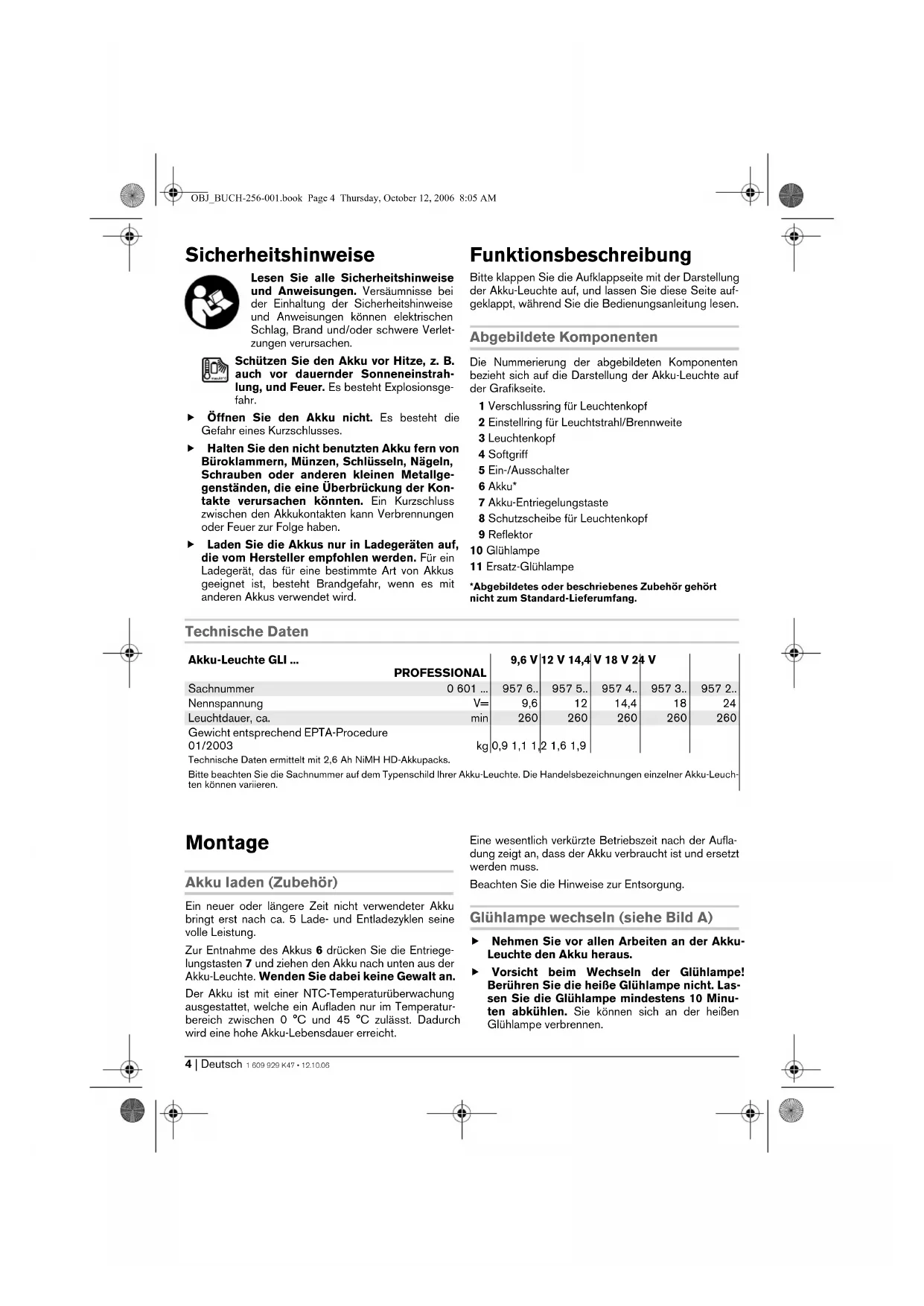 - 3 2 Nennspannung V= 9,6 12 14,4 18 24 Leuchtdauer, ca. min 260 260 260 260 260 Gewicht entsprechend EPTA-Procedure 01/2003 kg 0,9 1,1 1,2 1,6 1,9 Technische Daten ermittelt mit 2,6 Ah NiMH HD-Akkupacks. Bitte beachten Sie die Sachnummer auf dem Typenschild Ihrer Akku-Leuchte. Die Handelsbezeichnungen einzelner Akku-Leuch- ten können variieren. OBJ_BUCH-256-001.book Page 4 Thursday, October 12, 2006 8:05 AMDeutsch | 51 609 929 K47 • 12.10.06 Hinweis: Verwenden Sie zum Wechseln der Glüh- lampe ein weiches Tuch. Berühren Sie den Glaskolben auf keinen Fall mit den bloßen Händen. Die Glühlampe kann ansonsten beschädigt werden. p. 957