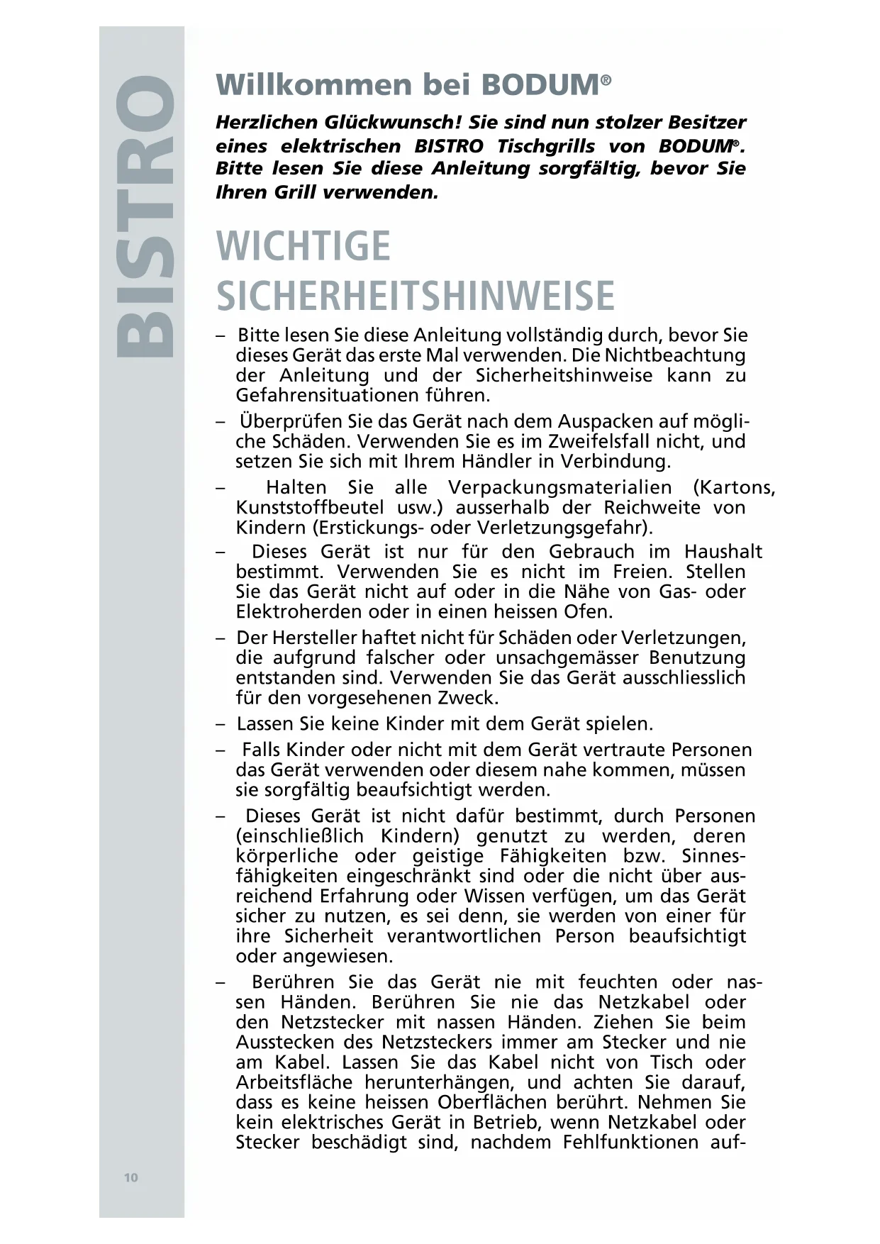 Herzlichen Glückwunsch! Sie sind nun stolzer Besitzer eines elektrischen BISTRO Tischgrills von BODUM.itte lessen Sie diese Anleitung sorgfältig, bevor Sie ihren Grill verwenden.