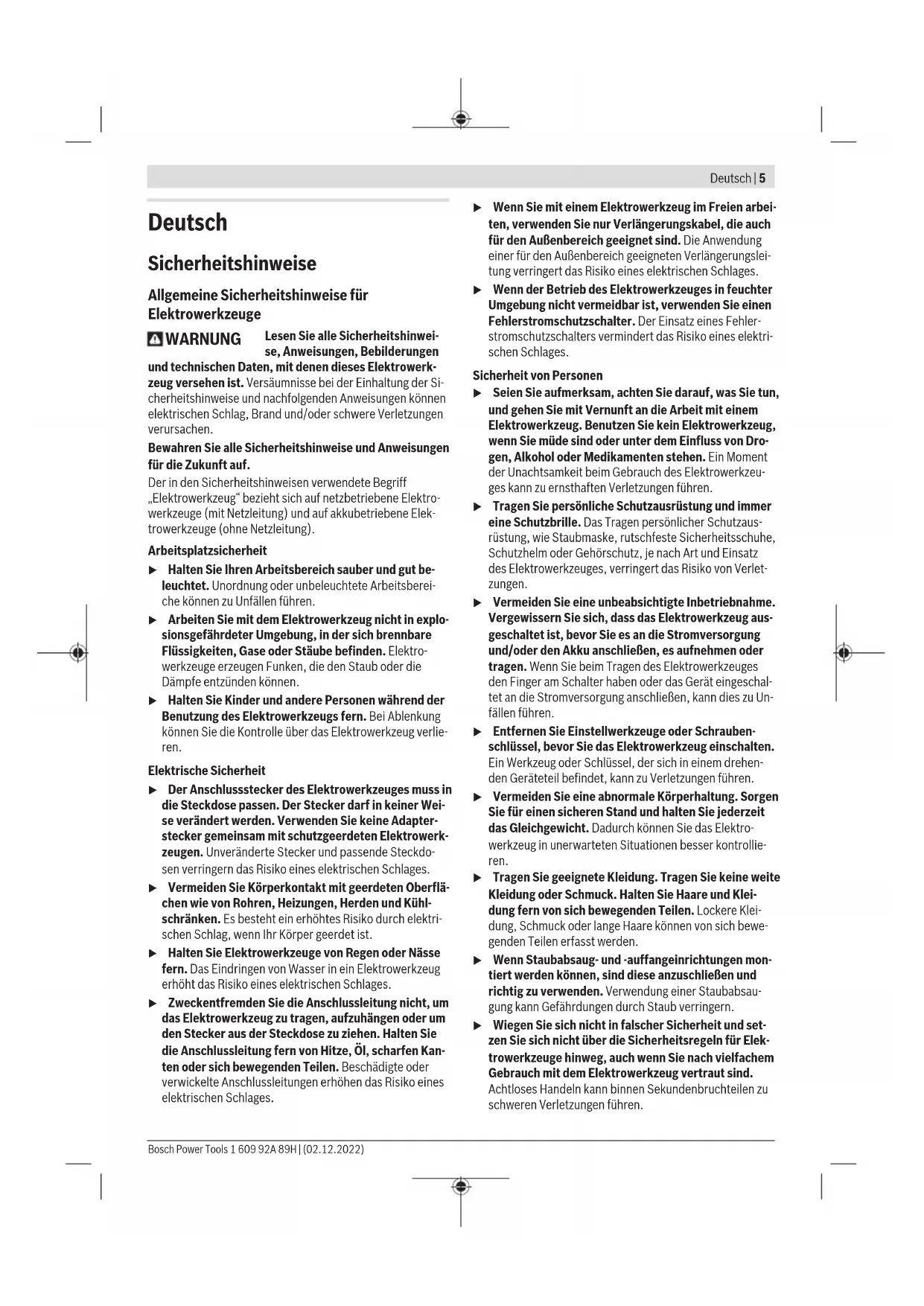 (12) (13) (15) (14) (16) (1) (17) (17) (1) (16) (5) (5) 1 609 92A 89H | (02.12.2022) Bosch Power ToolsDeutsch | 5 Deutsch Sicherheitshinweise Allgemeine Sicherheitshinweise für Elektrowerkzeuge WARNUNG Lesen Sie alle Sicherheitshinwei- se, Anweisungen, Bebilderungen und technischen Daten, mit denen dieses Elektrowerk- zeug versehen ist. Versäumnisse bei der Einhaltung der Si- cherheitshinweise und nachfolgenden Anweisungen können elektrischen Schlag, Brand und/oder schwere Verletzungen verursachen. Bewahren Sie alle Sicherheitshinweise und Anweisungen für die Zukunft auf. Der in den Sicherheitshinweisen verwendete Begriff „Elektrowerkzeug“ bezieht sich auf netzbetriebene Elektro- werkzeuge (mit Netzleitung) und auf akkubetriebene Elek- trowerkzeuge (ohne Netzleitung). Arbeitsplatzsicherheit u Halten Sie Ihren Arbeitsbereich sauber und gut be- leuchtet. Unordnung oder unbeleuchtete Arbeitsberei- che können zu Unfällen führen. u Arbeiten Sie mit dem Elektrowerkzeug nicht in explo- sionsgefährdeter Umgebung, in der sich brennbare Flüssigkeiten, Gase oder Stäube befinden. Elektro- werkzeuge erzeugen Funken, die den Staub oder die Dämpfe entzünden können. u Halten Sie Kinder und andere Personen während der Benutzung des Elektrowerkzeugs fern. Bei Ablenkung können Sie die Kontrolle über das Elektrowerkzeug verlie- ren. Elektrische Sicherheit u Der Anschlussstecker des Elektrowerkzeuges muss in die Steckdose passen. Der Stecker darf in keiner Wei- se verändert werden. Verwenden Sie keine Adapter- stecker gemeinsam mit schutzgeerdeten Elektrowerk- zeugen. Unveränderte Stecker und passende Steckdo- sen verringern das Risiko eines elektrischen Schlages. u Vermeiden Sie Körperkontakt mit geerdeten Oberflä- chen wie von Rohren, Heizungen, Herden und Kühl- schränken. Es besteht ein erhöhtes Risiko durch elektri- schen Schlag, wenn Ihr Körper geerdet ist. u Halten Sie Elektrowerkzeuge von Regen oder Nässe fern. Das Eindringen von Wasser in ein Elektrowerkzeug erhöht das Risiko eines elektrischen Schlages. u Zweckentfremden Sie die Anschlussleitung nicht, um das Elektrowerkzeug zu tragen, aufzuhängen oder um den Stecker aus der Steckdose zu ziehen. Halten Sie die Anschlussleitung fern von Hitze, Öl, scharfen Kan- ten oder sich bewegenden Teilen. Beschädigte oder verwickelte Anschlussleitungen erhöhen das Risiko eines elektrischen Schlages. u Wenn Sie mit einem Elektrowerkzeug im Freien arbei- ten, verwenden Sie nur Verlängerungskabel, die auch für den Außenbereich geeignet sind. Die Anwendung einer für den Außenbereich geeigneten Verlängerungslei- tung verringert das Risiko eines elektrischen Schlages. u Wenn der Betrieb des Elektrowerkzeuges in feuchter Umgebung nicht vermeidbar ist, verwenden Sie einen Fehlerstromschutzschalter. Der Einsatz eines Fehler- stromschutzschalters vermindert das Risiko eines elektri- schen Schlages. Sicherheit von Personen u Seien Sie aufmerksam, achten Sie darauf, was Sie tun, und gehen Sie mit Vernunft an die Arbeit mit einem Elektrowerkzeug. Benutzen Sie kein Elektrowerkzeug, wenn Sie müde sind oder unter dem Einfluss von Dro- gen, Alkohol oder Medikamenten stehen. Ein Moment der Unachtsamkeit beim Gebrauch des Elektrowerkzeu- ges kann zu ernsthaften Verletzungen führen. u Tragen Sie persönliche Schutzausrüstung und immer eine Schutzbrille. Das Tragen persönlicher Schutzaus- rüstung, wie Staubmaske, rutschfeste Sicherheitsschuhe, Schutzhelm oder Gehörschutz, je nach Art und Einsatz des Elektrowerkzeuges, verringert das Risiko von Verlet- zungen. u Vermeiden Sie eine unbeabsichtigte Inbetriebnahme. Vergewissern Sie sich, dass das Elektrowerkzeug aus- geschaltet ist, bevor Sie es an die Stromversorgung und/oder den Akku anschließen, es aufnehmen oder tragen. Wenn Sie beim Tragen des Elektrowerkzeuges den Finger am Schalter haben oder das Gerät eingeschal- tet an die Stromversorgung anschließen, kann dies zu Un- fällen führen. u Entfernen Sie Einstellwerkzeuge oder Schrauben- schlüssel, bevor Sie das Elektrowerkzeug einschalten. Ein Werkzeug oder Schlüssel, der sich in einem drehen- den Geräteteil befindet, kann zu Verletzungen führen. u Vermeiden Sie eine abnormale Körperhaltung. Sorgen Sie für einen sicheren Stand und halten Sie jederzeit das Gleichgewicht. Dadurch können Sie das Elektro- werkzeug in unerwarteten Situationen besser kontrollie- ren. u Tragen Sie geeignete Kleidung. Tragen Sie keine weite Kleidung oder Schmuck. Halten Sie Haare und Klei- dung fern von sich bewegenden Teilen. Lockere Klei- dung, Schmuck oder lange Haare können von sich bewe- genden Teilen erfasst werden. u Wenn Staubabsaug- und -auffangeinrichtungen mon- tiert werden können, sind diese anzuschließen und richtig zu verwenden. Verwendung einer Staubabsau- gung kann Gefährdungen durch Staub verringern. u Wiegen Sie sich nicht in falscher Sicherheit und set- zen Sie sich nicht über die Sicherheitsregeln für Elek- trowerkzeuge hinweg, auch wenn Sie nach vielfachem Gebrauch mit dem Elektrowerkzeug vertraut sind. Achtloses Handeln kann binnen Sekundenbruchteilen zu schweren Verletzungen führen. Bosch Power Tools 1 609 92A 89H | (02.12.2022)6 | Deutsch Verwendung und Behandlung des Elektrowerkzeugs u Überlasten Sie das Elektrowerkzeug nicht. Verwenden Sie für Ihre Arbeit das dafür bestimmte Elektrowerk- zeug. Mit dem passenden Elektrowerkzeug arbeiten Sie besser und sicherer im angegebenen Leistungsbereich. u Benutzen Sie kein Elektrowerkzeug, dessen Schalter defekt ist. Ein Elektrowerkzeug, das sich nicht mehr ein- oder ausschalten lässt, ist gefährlich und muss repariert werden. u Ziehen Sie den Stecker aus der Steckdose und/oder entfernen Sie einen abnehmbaren Akku, bevor Sie Ge- räteeinstellungen vornehmen, Einsatzwerkzeugteile wechseln oder das Elektrowerkzeug weglegen. Diese Vorsichtsmaßnahme verhindert den unbeabsichtigten Start des Elektrowerkzeuges. u Bewahren Sie unbenutzte Elektrowerkzeuge außer- halb der Reichweit
