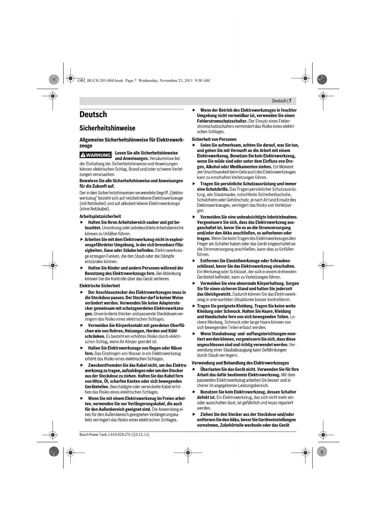 OBJ_BUCH-203-004.book Page 6 Wednesday, November 23, 2011 9:50 AMDeutsch | 7 Bosch Power Tools 1 619 929 J79 | (23.11.11) Deutsch Sicherheitshinweise Allgemeine Sicherheitshinweise für Elektrowerk- zeuge Lesen Sie alle Sicherheitshinweise und Anweisungen. Versäumnisse bei der Einhaltung der Sicherheitshinweise und Anweisungen können elektrischen Schlag, Brand und/oder schwere Verlet- zungen verursachen. Bewahren Sie alle Sicherheitshinweise und Anweisungen für die Zukunft auf. Der in den Sicherheitshinweisen verwendete Begriff „Elektro- werkzeug“ bezieht sich auf netzbetriebene Elektrowerkzeuge (mit Netzkabel) und auf akkubetriebene Elektrowerkzeuge (ohne Netzkabel). Arbeitsplatzsicherheit f Halten Sie Ihren Arbeitsbereich sauber und gut be- leuchtet. Unordnung oder unbeleuchtete Arbeitsbereiche können zu Unfällen führen. f Arbeiten Sie mit dem Elektrowerkzeug nicht in explosi- onsgefährdeter Umgebung, in der sich brennbare Flüs- sigkeiten, Gase oder Stäube befinden. Elektrowerkzeu- ge erzeugen Funken, die den Staub oder die Dämpfe entzünden können. f Halten Sie Kinder und andere Personen während der Benutzung des Elektrowerkzeugs fern. Bei Ablenkung können Sie die Kontrolle über das Gerät verlieren. Elektrische Sicherheit f Der Anschlussstecker des Elektrowerkzeuges muss in die Steckdose passen. Der Stecker darf in keiner Weise verändert werden. Verwenden Sie keine Adapterste- cker gemeinsam mit schutzgeerdeten Elektrowerkzeu- gen. Unveränderte Stecker und passende Steckdosen ver- ringern das Risiko eines elektrischen Schlages. f Vermeiden Sie Körperkontakt mit geerdeten Oberflä- chen wie von Rohren, Heizungen, Herden und Kühl- schränken. Es besteht ein erhöhtes Risiko durch elektri- schen Schlag, wenn Ihr Körper geerdet ist. f Halten Sie Elektrowerkzeuge von Regen oder Nässe fern. Das Eindringen von Wasser in ein Elektrowerkzeug erhöht das Risiko eines elektrischen Schlages. f Zweckentfremden Sie das Kabel nicht, um das Elektro- werkzeug zu tragen, aufzuhängen oder um den Stecker aus der Steckdose zu ziehen. Halten Sie das Kabel fern von Hitze, Öl, scharfen Kanten oder sich bewegenden Geräteteilen. Beschädigte oder verwickelte Kabel erhö- hen das Risiko eines elektrischen Schlages. f Wenn Sie mit einem Elektrowerkzeug im Freien arbei- ten, verwenden Sie nur Verlängerungskabel, die auch für den Außenbereich geeignet sind. Die Anwendung ei- nes für den Außenbereich geeigneten Verlängerungska- bels verringert das Risiko eines elektrischen Schlages. f Wenn der Betrieb des Elektrowerkzeuges in feuchter Umgebung nicht vermeidbar ist, verwenden Sie einen Fehlerstromschutzschalter. Der Einsatz eines Fehler- stromschutzschalters vermindert das Risiko eines elektri- schen Schlages. Sicherheit von Personen f Seien Sie aufmerksam, achten Sie darauf, was Sie tun, und gehen Sie mit Vernunft an die Arbeit mit einem Elektrowerkzeug. Benutzen Sie kein Elektrowerkzeug, wenn Sie müde sind oder unter dem Einfluss von Dro- gen, Alkohol oder Medikamenten stehen. Ein Moment der Unachtsamkeit beim Gebrauch des Elektrowerkzeuges kann zu ernsthaften Verletzungen führen. f Tragen Sie persönliche Schutzausrüstung und immer eine Schutzbrille. Das Tragen persönlicher Schutzausrüs- tung, wie Staubmaske, rutschfeste Sicherheitsschuhe, Schutzhelm oder Gehörschutz, je nach Art und Einsatz des Elektrowerkzeuges, verringert das Risiko von Verletzun- gen. f Vermeiden Sie eine unbeabsichtigte Inbetriebnahme. Vergewissern Sie sich, dass das Elektrowerkzeug aus- geschaltet ist, bevor Sie es an die Stromversorgung und/oder den Akku anschließen, es aufnehmen oder tragen. Wenn Sie beim Tragen des Elektrowerkzeuges den Finger am Schalter haben oder das Gerät eingeschaltet an die Stromversorgung anschließen, kann dies zu Unfällen führen. f Entfernen Sie Einstellwerkzeuge oder Schrauben- schlüssel, bevor Sie das Elektrowerkzeug einschalten. Ein Werkzeug oder Schlüssel, der sich in einem drehenden Geräteteil befindet, kann zu Verletzungen führen. f Vermeiden Sie eine abnormale Körperhaltung. Sorgen Sie für einen sicheren Stand und halten Sie jederzeit das Gleichgewicht. Dadurch können Sie das Elektrowerk- zeug in unerwarteten Situationen besser kontrollieren.
