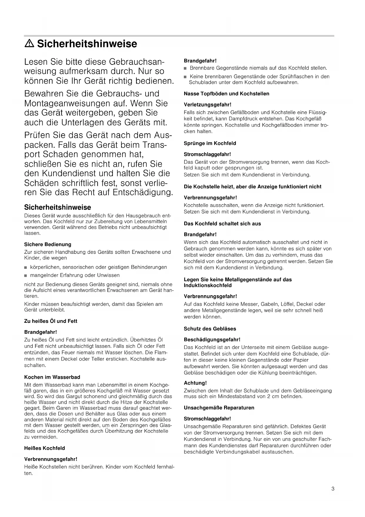 Sicherheitshinweise 3 Sicherheitshinweise3Ursachen für Schäden4Umweltschutz 4Umweltgerecht entsorgen4Tipps zum Energiesparen 4Induktionskochen 5Vorteile beim Induktionskochen5Geeignete Kochgefäße5Das Gerät kennen lernen 6Das Bedienfeld6Die Kochstellen 6Restwärmeanzeige 6Kochfeld einstellen 6Das Kochfeld ein- und ausschalten 6Kochstelle einrichten6Kochtabelle 7Kindersicherung 8Kindersicherung ein- und ausschalten 8Ständige Kindersicherung ein- und ausschalten 8Powerboost-Funktion 8Gebrauchseinschränkungen8Einschalten9Ausschalten 9Grundeinstellungen9Zugang zu den Grundeinstellungen9Reinigung und Pflege10Kochfeld 10Kochfeldrahmen 10Betriebsstörungen beheben10Normale Geräusche bei Betrieb des Gerätes 11Kundendienst11 Produktinfo Weitere Informationen zu Produkten, Zubehör, Ersatzteilen und Services finden Sie im Internet: www.bosch-home.com und Online-Shop: www.bosch-eshop.comFür Produktinformationen sowie Anwendungs- und Bedienungs-fragen berät Sie unser Bosch-Infoteam unter Tel.: 01805 304050 (Mo-Fr: 8.00-18.00 Uhr erreichbar, 0,14 EUR/Min aus dem Festnetz der T-Com, Mobil ggf. abwei-chend. Nur für Deutschland gültig.)