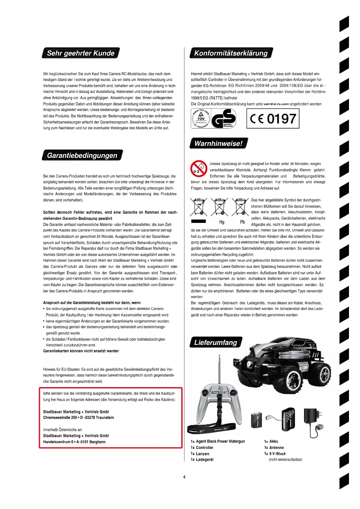 Bedingung gewährt: Die Garantie umfasst nachweisliche Material- oder Fabrikationsfehler, die zum Zeit- punkt des Kaufes des Carrera-Produkts vorhanden waren. Die Garantiefrist beträgt vom Verkaufsdatum an gerechnet 24 Monate. Ausgeschlossen ist der Garantiean- spruch auf Verschleißteile, Schäden durch unsachgemäße Behandlung/Nutzung oder bei Fremdeingrien. Die Reparatur darf nur durch die Firma Stadlbauer Marketing + Vertrieb GmbH oder ein von dieser autorisiertes Unternehmen ausgeführt werden. Im Rahmen dieser Garantie wird nach Wahl der Stadlbauer Marketing + Vertrieb GmbH das Carrera-Produkt als Ganzes oder nur die defekten Teile ausgetauscht oder gleichwertiger Ersatz gewährt. Von der Garantie ausgeschlossen sind Transport-, Verpackungs- und Fahrtkosten sowie vom Käufer zu vertretende Schäden. Diese sind vom Käufer zu tragen. Die Garantieansprüche können ausschließlich vom Ersterwer- ber des Carrera-Produkts in Anspruch genommen werden. Anspruch auf die Garantieleistung besteht nur dann, wenn
