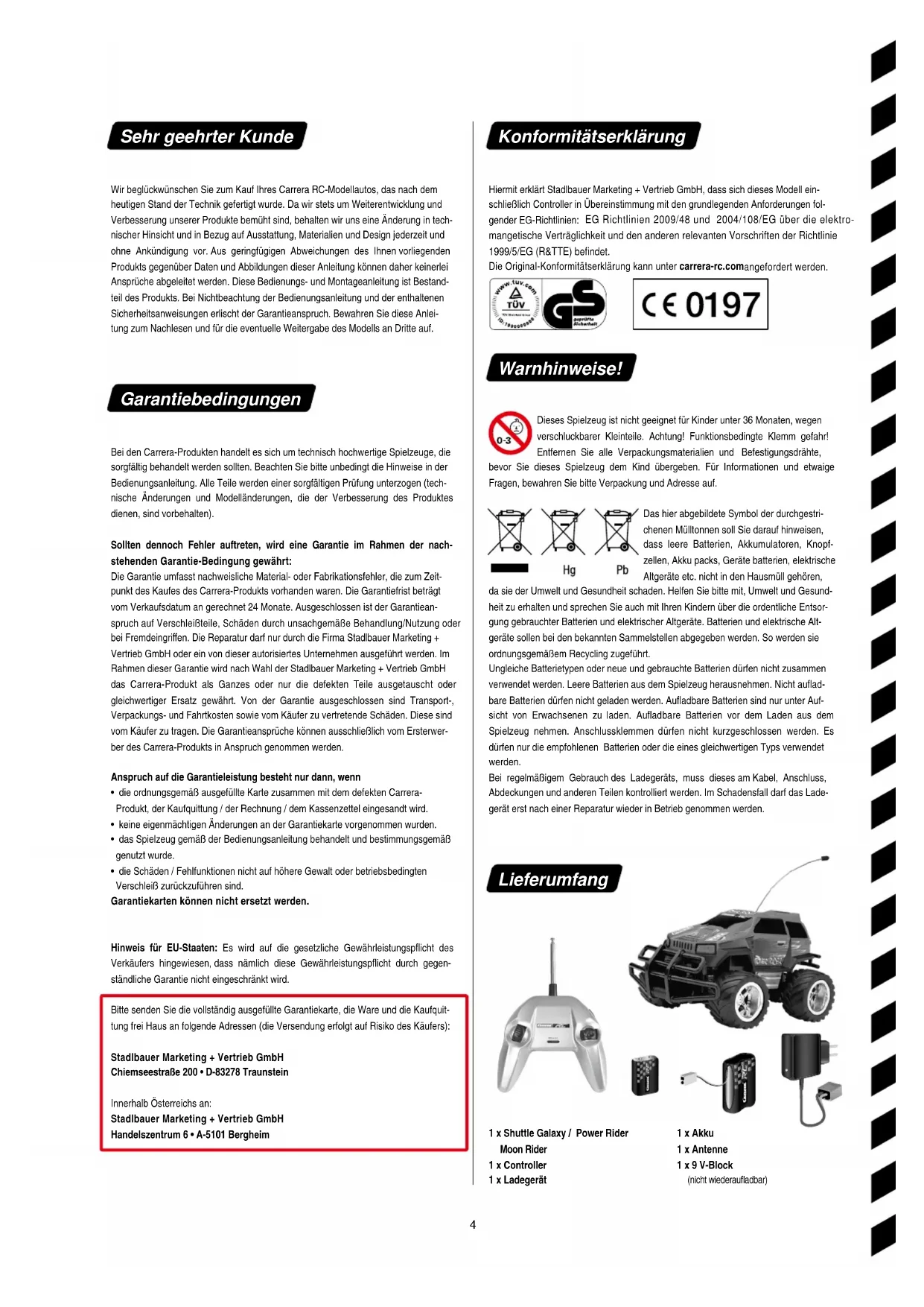 - die Schäden / Fehlfunktionen nicht auf höhere Gewalt oder betriebsbedingten Verschleiß zurückzuführen sind. Garantiekarten können nicht ersetzt werden. Hinweis für EUStaaten: Es wird auf die gesetzliche Gewährleistungspicht des Verkäufers hingewiesen, dass nämlich diese Gewährleistungspicht durch gegen- ständliche Garantie nicht eingeschränkt wird. Bitte senden Sie die vollständig ausgefüllte Garantiekarte, die Ware und die Kaufquit- tung frei Haus an folgende Adressen (die Versendung erfolgt auf Risiko des Käufers): Stadlbauer Marketing + Vertrieb GmbH Chiemseestraße 200 • D83278 Traunstein Innerhalb Österreichs an: Stadlbauer Marketing + Vertrieb GmbH Handelszentrum 6 • A5101 Bergheim Konformitätserklärung Hiermit erklärt Stadlbauer Marketing + Vertrieb GmbH, dass sich dieses Modell ein- schließlich Controller in Übereinstimmung mit den grundlegenden Anforderungen fol- gender EG-Richtlinien: EG Richtlinien 2009/48 und 2004/108/EG über die elektro- mangetische Verträglichkeit und den anderen relevanten Vorschriften der Richtlinie 1999/5/EG (R&TTE) bendet. Die Original-Konformitätserklärung kann unter carrerarc.com angefordert werden. Warnhinweise! Dieses Spielzeug ist nicht geeignet für Kinder unter 36 Monaten, wegen verschluckbarer Kleinteile. Achtung! Funktionsbedingte Klemm gefahr! Entfernen Sie alle Verpackungsmaterialien und Befestigungsdrähte, bevor Sie dieses Spielzeug dem Kind übergeben. Für Informationen und etwaige Fragen, bewahren Sie bitte Verpackung und Adresse auf. Das hier abgebildete Symbol der durchgestri- chenen Mülltonnen soll Sie darauf hinweisen, dass leere Batterien, Akkumulatoren, Knopf- zellen, Akku packs, Geräte batterien, elektrische Altgeräte etc. nicht in den Hausmüll gehören, da sie der Umwelt und Gesundheit schaden. Helfen Sie bitte mit, Umwelt und Gesund- heit zu erhalten und sprechen Sie auch mit Ihren Kindern über die ordentliche Entsor- gung gebrauchter Batterien und elektrischer Altgeräte. Batterien und elektrische Alt- geräte sollen bei den bekannten Sammelstellen abgegeben werden. So werden sie ordnungsgemäßem Recycling zugeführt. Ungleiche Batterietypen oder neue und gebrauchte Batterien dürfen nicht zusammen verwendet werden. Leere Batterien aus dem Spielzeug herausnehmen. Nicht auad- bare Batterien dürfen nicht geladen werden. Auadbare Batterien sind nur unter Auf- sicht von Erwachsenen zu laden. Auadbare Batterien vor dem Laden aus dem Spielzeug nehmen. Anschlussklemmen dürfen nicht kurzgeschlossen werden. Es dürfen nur die empfohlenen Batterien oder die eines gleichwertigen Typs verwendet werden. Bei regelmäßigem Gebrauch des Ladegeräts, muss dieses am Kabel, Anschluss, Abdeckungen und anderen Teilen kontrolliert werden. Im Schadensfall darf das Lade- gerät erst nach einer Reparatur wieder in Betrieb genommen werden. Lieferumfang 1 x Shuttle Galaxy / Power Rider Moon Rider 1 x Controller 1 x Ladegerät 1 x Akku 1 x Antenne 1 x 9 VBlock (nicht wiederauadbar)1