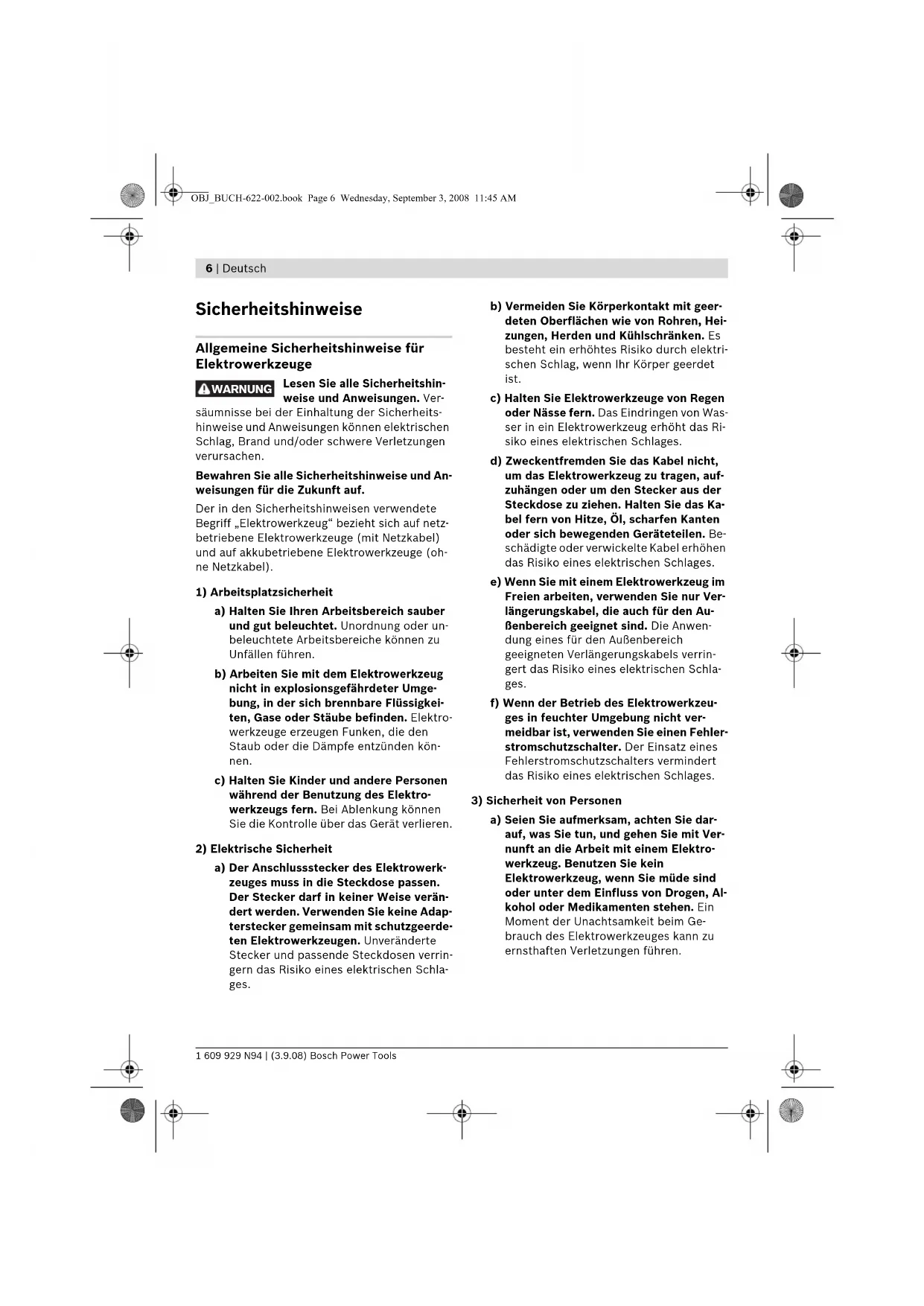 a) Seien Sie aufmerksam, achten Sie dar- auf, was Sie tun, und gehen Sie mit Ver- nunft an die Arbeit mit einem Elektro- werkzeug. Benutzen Sie kein Elektrowerkzeug, wenn Sie müde sind oder unter dem Einfluss von Drogen, Al- kohol oder Medikamenten stehen. Ein Moment der Unachtsamkeit beim Ge- brauch des Elektrowerkzeuges kann zu ernsthaften Verletzungen führen. WARNUNG OBJ_BUCH-622-002.book Page 6 Wednesday, September 3, 2008 11:45 AMDeutsch | 7 Bosch Power Tools 1 609 929 N94 | (3.9.08) b) Tragen Sie persönliche Schutzausrüs- tung und immer eine Schutzbrille. Das Tragen persönlicher Schutzausrüstung, wie Staubmaske, rutschfeste Sicherheits- schuhe, Schutzhelm oder Gehörschutz, je nach Art und Einsatz des Elektrowerkzeu- ges, verringert das Risiko von Verletzun- gen. c) Vermeiden Sie eine unbeabsichtigte In- betriebnahme. Vergewissern Sie sich, dass das Elektrowerkzeug ausgeschaltet ist, bevor Sie es an die Stromversorgung und/oder den Akku anschließen, es auf- nehmen oder tragen. Wenn Sie beim Tra- gen des Elektrowerkzeuges den Finger am Schalter haben oder das Gerät einge- schaltet an die Stromversorgung anschlie- ßen, kann dies zu Unfällen führen. d) Entfernen Sie Einstellwerkzeuge oder Schraubenschlüssel, bevor Sie das Elek- trowerkzeug einschalten. Ein Werkzeug oder Schlüssel, der sich in einem drehen- den Geräteteil befindet, kann zu Verlet- zungen führen. e) Vermeiden Sie eine abnormale Körper- haltung. Sorgen Sie für einen sicheren Stand und halten Sie jederzeit das Gleichgewicht. Dadurch können Sie das Elektrowerkzeug in unerwarteten Situati- onen besser kontrollieren. f) Tragen Sie geeignete Kleidung. Tragen Sie keine weite Kleidung oder Schmuck. Halten Sie Haare, Kleidung und Hand- schuhe fern von sich bewegenden Tei- len. Lockere Kleidung, Schmuck oder lan- ge Haare können von sich bewegenden Teilen erfasst werden. g) Wenn Staubabsaug- und -auffangein- richtungen montiert werden können, vergewissern Sie sich, dass diese ange- schlossen sind und richtig verwendet werden. Verwendung einer Staubabsau- gung kann Gefährdungen durch Staub ver- ringern.