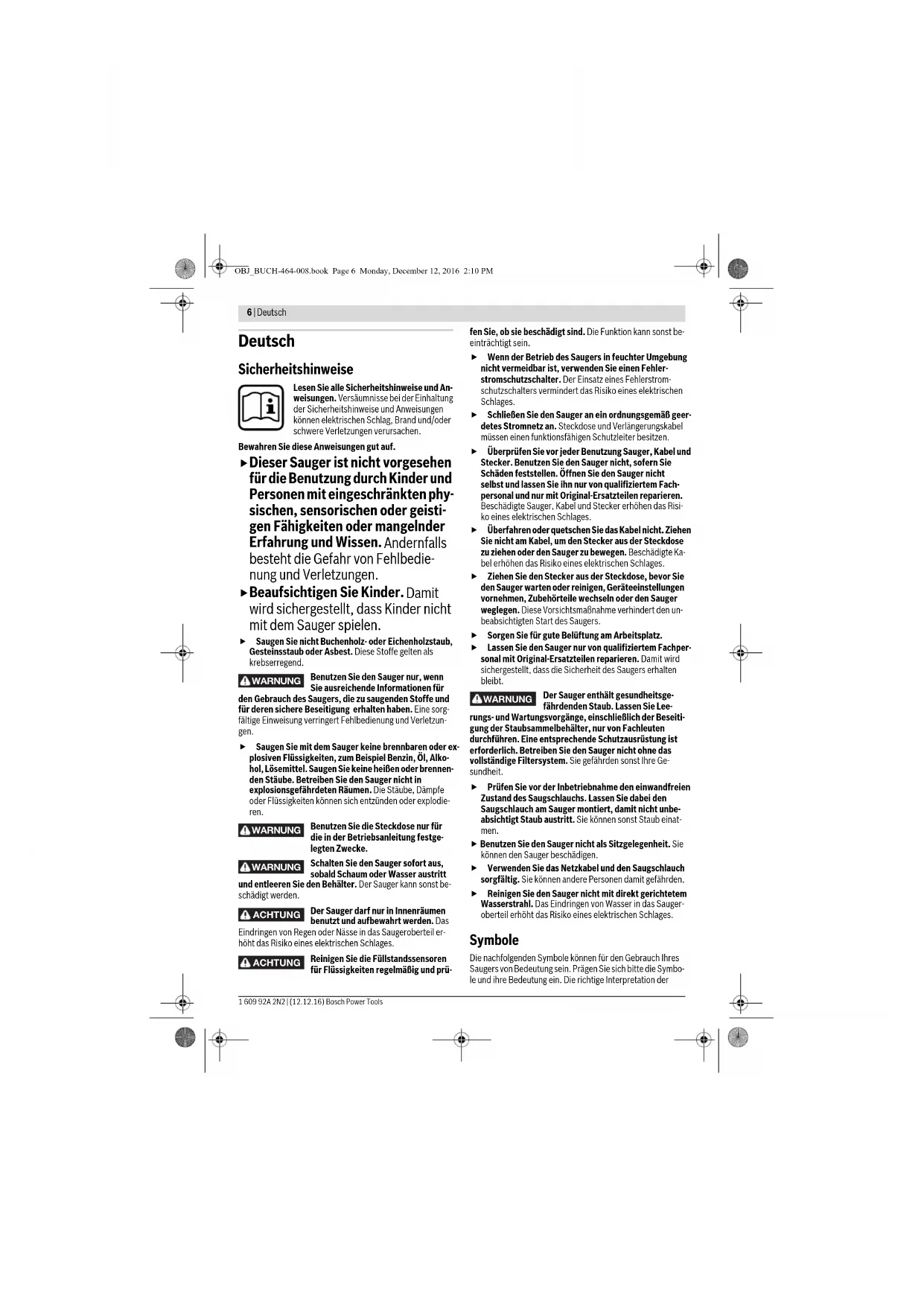 WARNUNG WARNUNG WARNUNG ACHTUNG ACHTUNG WARNUNG OBJ_BUCH-464-008.book Page 6 Monday, December 12, 2016 2:10 PMDeutsch | 7 Bosch Power Tools 1 609 92A 2N2 | (12.12.16) Symbole hilft Ihnen, den Sauger besser und sicherer zu ge-