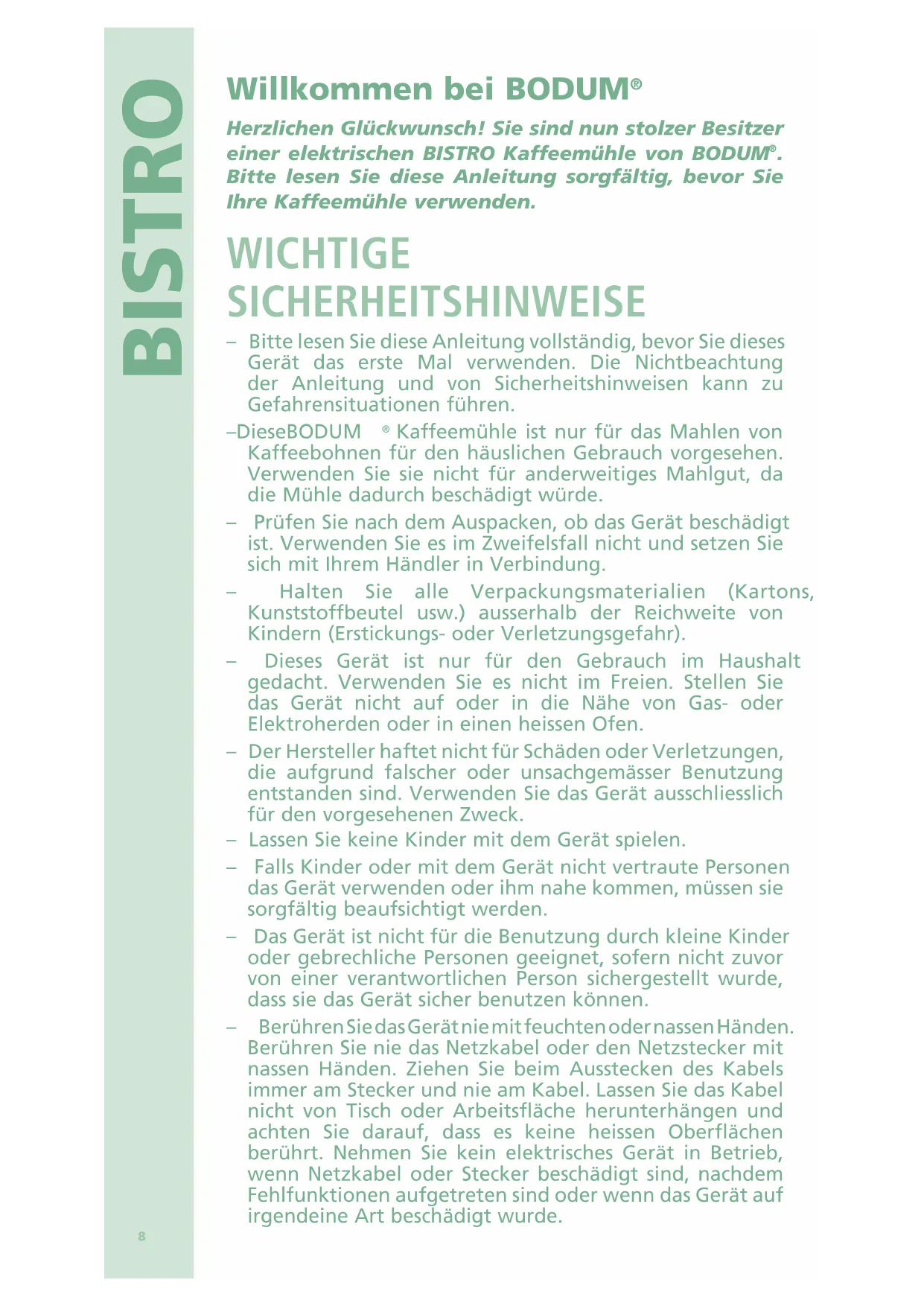 Bitte lesen Sie diese Anleitung sorgfältig, bevor Sie Ihre Kaffeemühle verwenden. WICHTIGE SICHERHEITSHINWEISE – Bitte lesen Sie diese Anleitung vollständig, bevor Sie dieses Gerät das erste Mal verwenden. Die Nichtbeachtung der Anleitung und von Sicherheitshinweisen kann zu Gefahrensituationen führen. – Diese BODUM