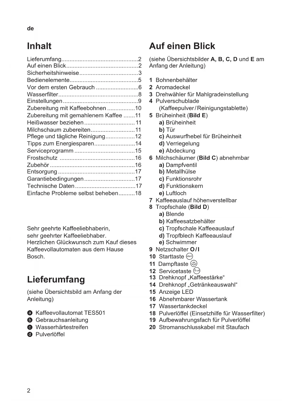 Finden Sie kostenlos die Bedienungsanleitung des Geräts VeroCafe TES50159DE BOSCH als PDF.