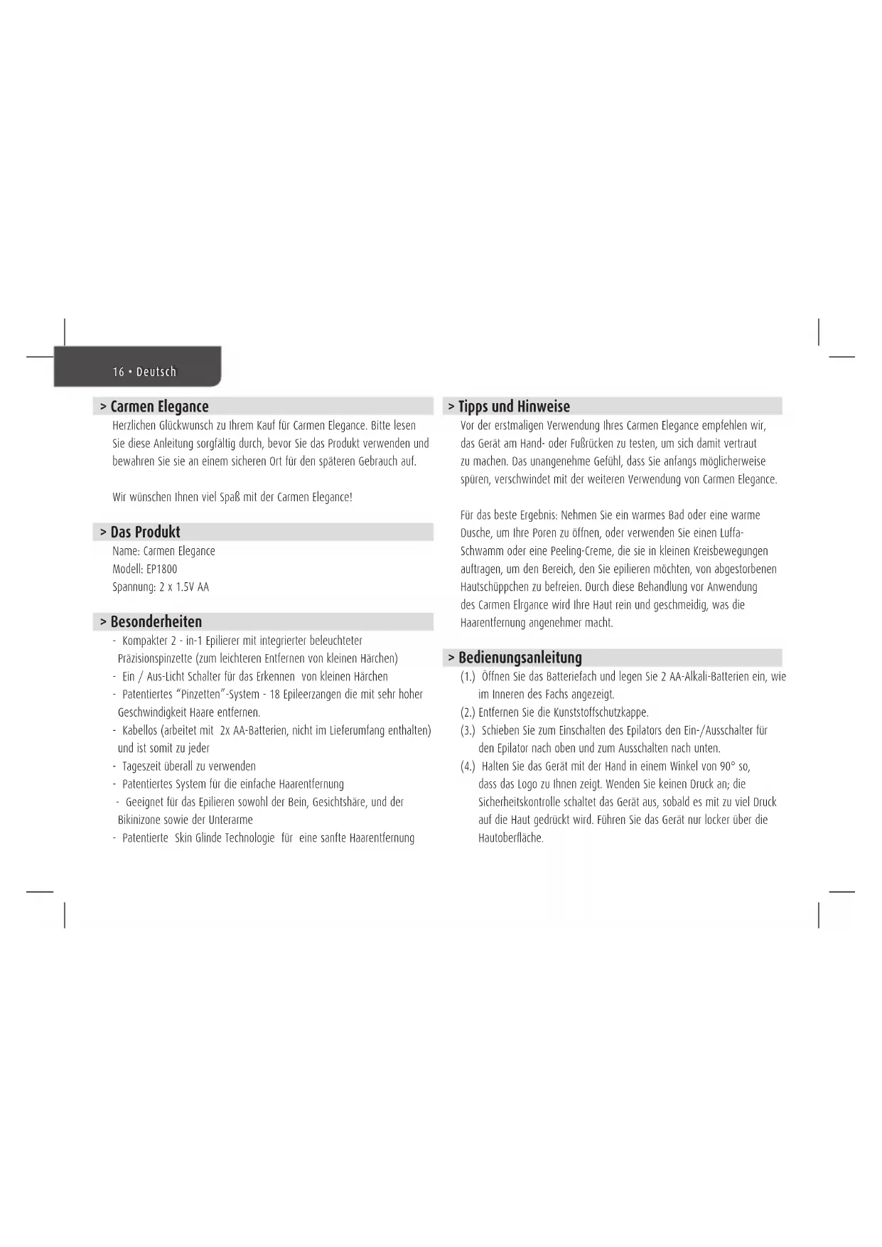 - Replacez le capuchon protecteur sur votre appareil lorsque vous ne l’utilisez pas. > Environnement et mise au rebut Ne jetez jamais votre appareil avec les ordures ménagères ordinaires. Suivez les règlementations de votre lieu de domicile en matière d’élimination des déchets ou rapportez l’appareil au détaillant. > Garantie La garantie couvre ce produit pour une période de 2 ans, à l’exception des pièces individuelles, à compter de la date initiale d’achat. L’utilisation de la garantie n’entraîne pas une extension de la période de garantie. La garantie couvre les vices de fabrication et les défauts matériels sur les pièces d’origine. Cette garantie ne comprend pas l’usure normale et l’endommagement du produit par accident, mauvais usage, usage abusif, altération du produit ou utilisation incompatible avec les instructions techniques et/ou consignes de sécurité requises. Si votre produit nécessite une réparation, vous devez contacter un dépanneur agréé. Ne jetez jamais votre appareil avec les ordures ménagères ordinaires. Suivez les règlementations de votre lieu de domicile en matière d’élimination des déchets ou rapportez l’appareil au détaillant. Conservez le ticket de caisse du détaillant à titre de reçu. Carmen a une politique d’amélioration continue au niveau de la qualité et du design de ses produits. Par conséquent, Carmen se réserve le droit de modifier à tout moment les caractéristiques de ses produits.16 • Deutsch > Carmen Elegance Herzlichen Glückwunsch zu Ihrem Kauf für Carmen Elegance. Bitte lesen Sie diese Anleitung sorgfältig durch, bevor Sie das Produkt verwenden und bewahren Sie sie an einem sicheren Ort für den späteren Gebrauch auf. Wir wünschen Ihnen viel Spaß mit der Carmen Elegance! > Das Produkt Name: Carmen Elegance Modell: EP1800 Spannung: 2 x 1.5V AA > Besonderheiten - Kompakter 2 - in-1 Epilierer mit integrierter beleuchteter Präzisionspinzette (zum leichteren Entfernen von kleinen Härchen) - Ein / Aus-Licht Schalter für das Erkennen von kleinen Härchen - Patentiertes “Pinzetten”-System - 18 Epileerzangen die mit sehr hoher Geschwindigkeit Haare entfernen. - Kabellos (arbeitet mit 2x AA-Batterien, nicht im Lieferumfang enthalten) und ist somit zu jeder - Tageszeit überall zu verwenden - Patentiertes System für die einfache Haarentfernung - Geeignet für das Epilieren sowohl der Bein, Gesichtshäre, und der Bikinizone sowie der Unterarme - Patentierte Skin Glinde Technologie für eine sanfte Haarentfernung > Tipps und Hinweise Vor der erstmaligen Verwendung Ihres Carmen Elegance empfehlen wir, das Gerät am Hand- oder Fußrücken zu testen, um sich damit vertraut zu machen. Das unangenehme Gefühl, dass Sie anfangs möglicherweise spüren, verschwindet mit der weiteren Verwendung von Carmen Elegance. Für das beste Ergebnis: Nehmen Sie ein warmes Bad oder eine warme Dusche, um Ihre Poren zu öffnen, oder verwenden Sie einen Luffa- Schwamm oder eine Peeling-Creme, die sie in kleinen Kreisbewegungen auftragen, um den Bereich, den Sie epilieren möchten, von abgestorbenen Hautschüppchen zu befreien. Durch diese Behandlung vor Anwendung des Carmen Elrgance wird Ihre Haut rein und geschmeidig, was die Haarentfernung angenehmer macht. > Bedienungsanleitung (1.) Öffnen Sie das Batteriefach und legen Sie 2 AA-Alkali-Batterien ein, wie im Inneren des Fachs angezeigt. (2.) Entfernen Sie die Kunststoffschutzkappe. (3.) Schieben Sie zum Einschalten des Epilators den Ein-/Ausschalter für den Epilator nach oben und zum Ausschalten nach unten. (4.) Halten Sie das Gerät mit der Hand in einem Winkel von 90° so, dass das Logo zu Ihnen zeigt. Wenden Sie keinen Druck an; die Sicherheitskontrolle schaltet das Gerät aus, sobald es mit zu viel Druck auf die Haut gedrückt wird. Führen Sie das Gerät nur locker über die Hautoberfläche.17 • Deutsch (5.) Führen Sie kurze, schnelle Bewegungen wie mit einem Besen oder einer Bürste in Richtung des Haarwuchses aus. (6.) Denken Sie daran, das Bein auszustrecken, bevor Sie Haare vom hinteren Kniebereich entfernen. (7.) Kann auch in der Bikinizone eingesetzt werden (halten Sie den zu behandelnden Hautbereich mit einer Hand straff). (8.) Mit dem Epilator können einzelne Haare von Oberlippe und Kinn entfernt werden. (9.) Kann zur Entfernung von Achselhaar verwendet werden (strecken Sie den Arm, damit der Bereich straff ist). (10.) Schalten Sie vor dem Reinigen das Gerät aus. Bürsten Sie den Epilatorkopf leicht ab, um Haarreste zu entfernen. (11.) Zur Verwendung der beleuchteten Zusatzpinzette drücken Sie einfach den Freigabeknopf für die beleuchtete Zusatzpinzette nach unten zur Unterseite des Epilators und ziehen die beleuchtete Zusatzpinzette dann aus dem Epilator. (12.) Schalten Sie das Licht an, indem Sie einmal auf den erhobenen Schalter drücken. Drücken Sei nochmal auf den erhobenen Schalter, um das Licht wieder auszuschalten. (13.) Die beleuchtete Zusatzpinzette kann jetzt verwendet werden, um einzelne Härchen in allen Körperregionen zu entfernen. (14.) Wenn Sie mit der Verwendung der beleuchteten Zusatzpinzette fertig sind, schieben Sie sie wieder in das Gerät. (15.) Zur Verwendung der Beleuchtungsfunktion am Epilator drücken Sie einmal auf den Ein-/Ausschalter am Gerät und das Licht strahlt aus dem Epilatorkopf. Carmen Elegance Verwenden Sie Ihren Carmen Elegance zur Vermeidung von Schweißbildung an einem Ort mit angenehmer Raumtemperatur.Stellen Sie sicher, dass die Bereiche, von denen Sie Haare entfernen möchten, sauber, trocken und frei von Feuchtigkeitscreme oder Fett sind. Vor der Entfernung von Haaren aus der Bikinizone oder den Achselhöhlen müssen abgestorbene Hautschüppchen mit einem Luffa-Schwamm oder Peeling-Creme unter einer warmen Dusche oder im Bad entfernt werden. Dies schafft auch Abhilfe gegen eingewachsene Haare. Wenn Sie die Haare in der Bikinizone oder unter den Armen schon länger nicht mehr entfernt hab