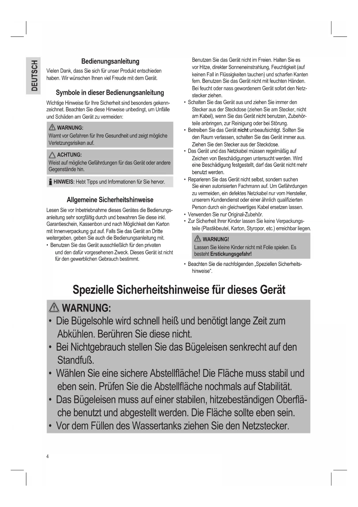 • Das Bügeleisen darf nicht unbeaufsichtigt gelassen werden,