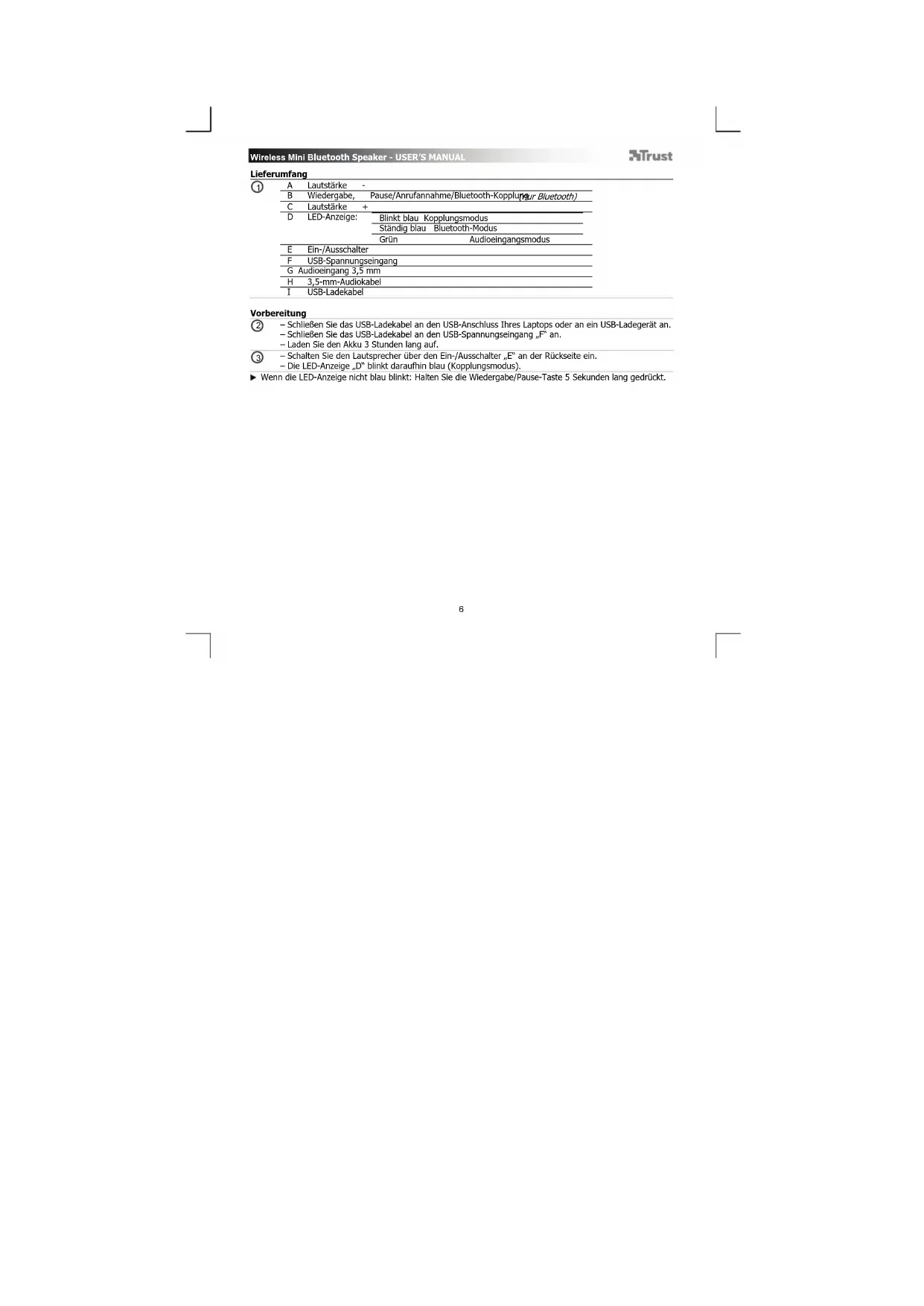 ergewissern Sie sich, dass Bluetooth an Ihrem Gerät eingeschaltet ist. – Stellen Sie bei der Verwendung von Bluetooth sicher, dass kein Audiokabel an den 3,5-mm-Audio-Eingang angeschlossen ist. – Führen Sie die standardmäßigen Konfigurationsschritte für Ihr Gerät durch. (iPad/iPhone, Android, Windows, Mac) – Der Abstand zwischen BT-Lautsprecher und Gerät ist zu groß. (Der maximale Abstand beträgt 10 m, bei Idealbedingungen.) - Laden Sie den Lautsprecher – Wenn Sie das Produkt in der Nähe großer Metalloberflächen verwenden, entfernen Sie die Metalloberfläche, oder stellen Sie das Produkt weiter weg von der Metalloberfläche auf. – Wände und Böden verringern die Funkreichweite erheblich. Stellen Sie den BT-Lautsprecher näher zur Audio-Quelle auf. – Halten Sie mit dem BT-Lautsprecher Abstand zu anderen drahtlosen Geräten. (z. B. zu drahtlosen Netzwerkroutern, Mäusen oder Tastaturen). Ton verzerrt Lautstärke zu gering – Überprüfen Sie die Lautstärkeeinstellung des Geräts (Tablet, Smartphone, PC). Falls das Problem fortbesteht, wenden Sie sich an den Helpdesk unter www.trust.com/19274/faqWireless Mini Bluetooth Speaker - USER’S MANUAL