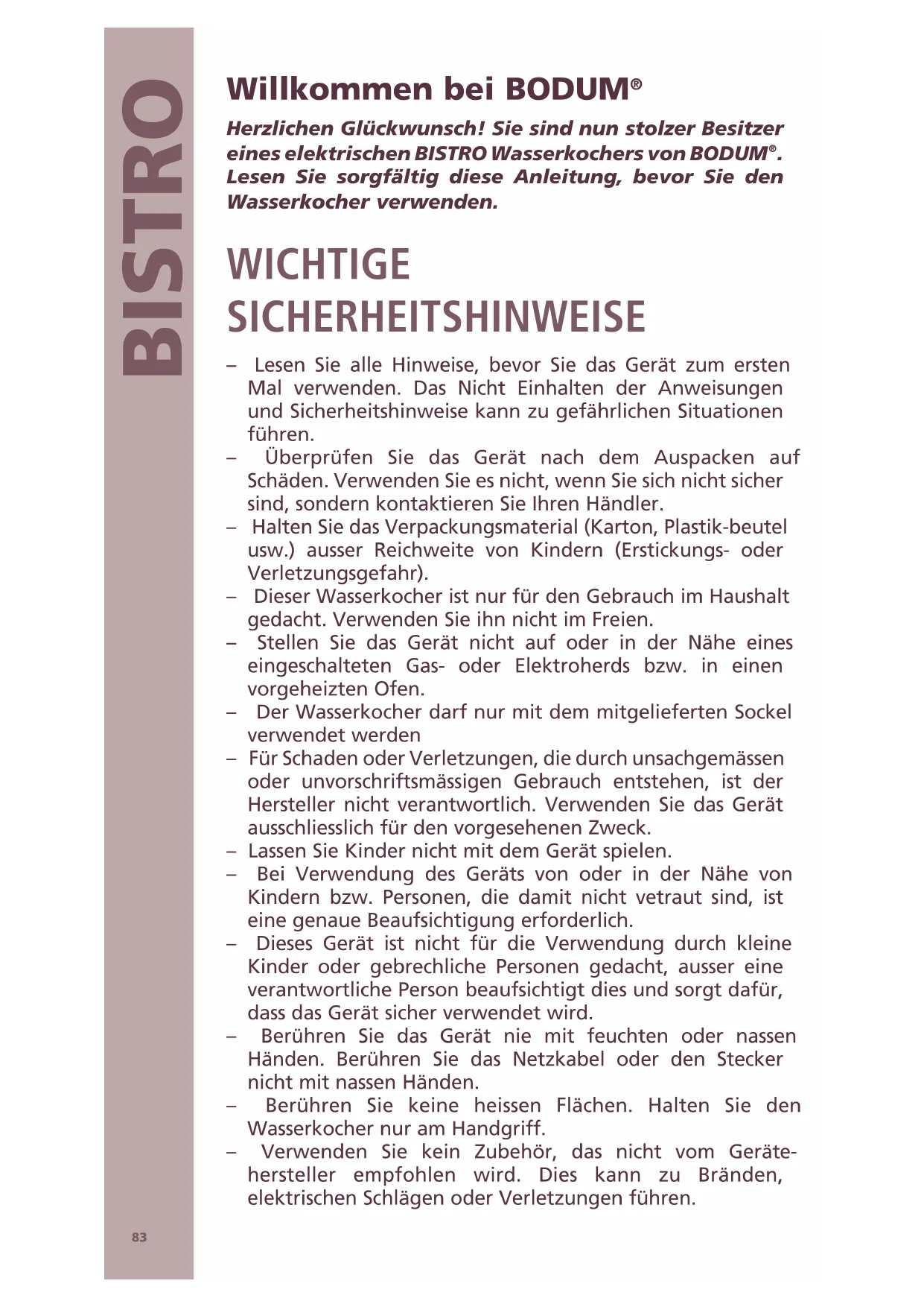 Lesen Sie sorgfältig diese Anleitung, bevor Sie den Wasserkocher verwenden. WICHTIGE SICHERHEITSHINWEISE – Lesen Sie alle Hinweise, bevor Sie das Gerät zum ersten Mal verwenden. Das Nicht Einhalten der Anweisungen und Sicherheitshinweise kann zu gefährlichen Situationen führen. – Überprüfen Sie das Gerät nach dem Auspacken auf Schäden. Verwenden Sie es nicht, wenn Sie sich nicht sicher sind, sondern kontaktieren Sie Ihren Händler. – Halten Sie das Verpackungsmaterial (Karton, Plastik-beutel usw.) ausser Reichweite von Kindern (Erstickungs- oder Verletzungsgefahr). – Dieser Wasserkocher ist nur für den Gebrauch im Haushalt gedacht. Verwenden Sie ihn nicht im Freien. – Stellen Sie das Gerät nicht auf oder in der Nähe eines eingeschalteten Gas- oder Elektroherds bzw. in einen vorgeheizten Ofen. – Der Wasserkocher darf nur mit dem mitgelieferten Sockel verwendet werden – Für Schaden oder Verletzungen, die durch unsachgemässen oder unvorschriftsmässigen Gebrauch entstehen, ist der Hersteller nicht verantwortlich. Verwenden Sie das Gerät ausschliesslich für den vorgesehenen Zweck. – Lassen Sie Kinder nicht mit dem Gerät spielen. – Bei Verwendung des Geräts von oder in der Nähe von Kindern bzw. Personen, die damit nicht vetraut sind, ist eine genaue Beaufsichtigung erforderlich. – Dieses Gerät ist nicht für die Verwendung durch kleine Kinder oder gebrechliche Personen gedacht, ausser eine verantwortliche Person beaufsichtigt dies und sorgt dafür, dass das Gerät sicher verwendet wird. – Berühren Sie das Gerät nie mit feuchten oder nassen Händen. Berühren Sie das Netzkabel oder den Stecker nicht mit nassen Händen. – Berühren Sie keine heissen Flächen. Halten Sie den Wasserkocher nur am Handgriff. – Verwenden Sie kein Zubehör, das nicht vom Geräte- hersteller empfohlen wird. Dies kann zu Bränden, elektrischen Schlägen oder Verletzungen führen.84 GEBRAUCHSANWEISUNG – Füllen Sie den Wasserkocher nie mit Wasser, während er auf dem Sockel steht. – Füllen Sie den Wasserkocher nie über die Marke «MAX». – Öffnen Sie während des Betriebs nicht den Deckel, da Sie sich ansonsten verbrühen könnten. – Wenn der Wasserkocher zu voll ist, kann kochendes Wasser herausspritzen. – Verwenden Sie den Wasserkocher nie ohne Deckel. – Giessen Sie das kochende Wasser immer langsam und vorsichtig aus und neigen Sie die Giessöffnung des Wasserkochers nicht zu rasch. – Achten Sie darauf, nicht mit dem Dampf in Berührung zu kommen, der beim Kochen des Wassers oder unmittelbar nach Abschalten des Wasserkochers durch die Öffnung im Deckel entweicht. Sie könnten sich sonst verbrühen. Öffnen Sie den Deckel vorsichtig, wenn Sie Wasser in einen noch heissen Wasserkocher nachfüllen möchten. – Kochendes Wasser kann Verbrennungen verursachen. – Bewegen Sie das Gerät äusserst vorsichtig, wenn es heisses Wasser enthält. – Fixieren Sie den Schalter nicht gewaltsam in der EIN- Stellung und nehmen Sie keine Veränderungen am Schalter vor, um diesen in der EIN-Stellung zu halten. Dies könnte dazu führen, dass um den Deckel herum Dampf austritt und der automatische Abschaltmechanismus beschädigt wird. Sie könnten sich dadurch verletzen. – Tauchen Sie das Gerät nie in Wasser: denken Sie daran, dass es sich um ein Elektrogerät handelt. – Reinigen Sie das Gerät nur mit einem feuchten Tuch. – Drehen Sie den Knopf auf «AUS» und ziehen Sie den Stecker aus der Steckdose, um das Gerät auszuschalten. – Ziehen Sie immer am Stecker und nicht am Kabel, um das Gerät vom Strom zu trennen. – Lassen Sie das Netzkabel nicht über die Kante von Tisch oder Arbeitsfläche hängen bzw. mit heissen Oberflächen in Berührung kommen. – Ziehen Sie den Stecker aus der Steckdose, wenn Sie den Wasserkocher nicht verwenden oder bevor Sie ihn reinigen. Warten Sie, bis der Kessel abgekühlt ist, bevor Sie Teile anbringen oder abnehmen bzw. bevor Sie ihn reinigen. – Nehmen Sie kein elektrisches Gerät in Betrieb, wenn Netzkabel oder Stecker beschädigt sind, nachdem Fehlfunktionen aufgetreten sind oder wenn das Gerät auf irgendeine Art beschädigt wurde. Bringen Sie das Gerät in diesem Fall zur Kontrolle, Reparatur oder Einstellung zum nächstgelegenen autorisierten Servicestützpunkt. – Um Gefahren zu vermeiden, versuchen Sie nie das Netzkabel des Geräts selbst auszutauschen. Hierfür sind spezielle Werkzeuge erforderlich. Lassen Sie die Reparatur oder den Austausch des Netzkabels ausschliesslich in einer85 BISTRO vom Hersteller autorisierten Servicewerkstätte durchfüh- ren, um die Sicherheit des Geräts zu gewährleisten. – Tauchen Sie Kabel und Stecker nicht in Wasser oder andere Flüssigkeiten, da dies Brände, elektrische Schläge oder Verletzungen verursachen könnte. – Vorsicht: Um die Gefahr eines Wiedereinschaltens der Sicherheitsabschaltung zu vermeiden, darf das Gerät nicht über eine externe Schaltvorrichtung wie beispiels- weise eine Zeitschaltuhr versorgt werden oder mit einem Stromkreis verbunden sein, der regelmässig durch das Stromversorgungsunternehmen ein- und ausgeschaltet wird. – Während der Reinigung des Gerätes darf dieses nicht an den Strom angeschlossen sein. – Die Abstellvorrichtung muss trocken sein bevor Sie das Gerät benutzen. INSTALLATION – Stellen Sie das Gerät auf eine stabile, ebene Oberfläche, die weder heiss ist noch sich in der Nähe einer Hitzequelle befindet. Die Oberfläche muss trocken sein. Halten Sie das Gerät und das Netzkabel ausser Reichweite von Kindern. – Stellen Sie den Sockel des Wasserkochers während der Verwendung nicht auf ein Metalltablett oder eine andere Metallfläche. – Überprüfen Sie, ob die auf dem Typenschild des Geräts angegebene Spannung mit der Netzspannung in Ihrer Region übereinstimmt. Schliessen Sie das Gerät nur an eine ordnungsgemäss geerdete Steckdose mit einer Ausgangsleistung von mindestens 6A an. (Verwenden Sie einen Fehlerstromschutzschalt