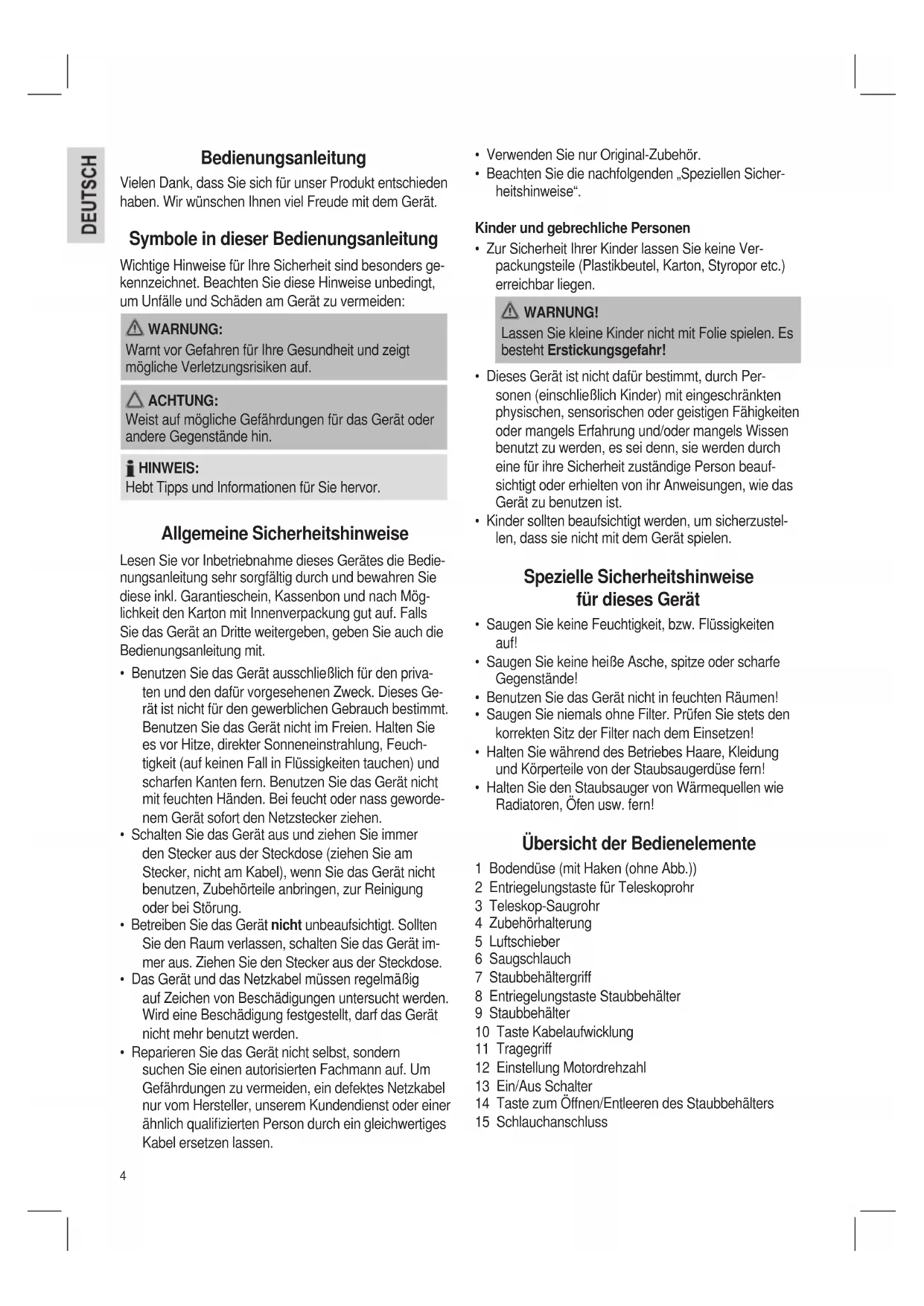 - Halten Sie den Staubsauger von Wärmequellen wie Radiatoren, Öfen usw. fern! Übersicht der Bedienelemente 1 Bodendüse (mit Haken (ohne Abb.)) 2 Entriegelungstaste für Teleskoprohr 3 Teleskop-Saugrohr 4 Zubehörhalterung 5 Luftschieber 6 Saugschlauch 7 Staubbehältergriff 8 Entriegelungstaste Staubbehälter 9 Staubbehälter 10 Taste Kabelaufwicklung 11 Tragegriff 12 Einstellung Motordrehzahl 13 Ein/Aus Schalter 14 Taste zum Öffnen/Entleeren des Staubbehälters 15 Schlauchanschluss Bedienungsanleitung Vielen Dank, dass Sie sich für unser Produkt entschieden haben. Wir wünschen Ihnen viel Freude mit dem Gerät. Symbole in dieser Bedienungsanleitung Wichtige Hinweise für Ihre Sicherheit sind besonders ge- kennzeichnet. Beachten Sie diese Hinweise unbedingt, um Unfälle und Schäden am Gerät zu vermeiden: WARNUNG: Warnt vor Gefahren für Ihre Gesundheit und zeigt mögliche Verletzungsrisiken auf. ACHTUNG: Weist auf mögliche Gefährdungen für das Gerät oder andere Gegenstände hin. HINWEIS: Hebt Tipps und Informationen für Sie hervor. Allgemeine Sicherheitshinweise Lesen Sie vor Inbetriebnahme dieses Gerätes die Bedie- nungsanleitung sehr sorgfältig durch und bewahren Sie diese inkl. Garantieschein, Kassenbon und nach Mög- lichkeit den Karton mit Innenverpackung gut auf. Falls Sie das Gerät an Dritte weitergeben, geben Sie auch die Bedienungsanleitung mit.