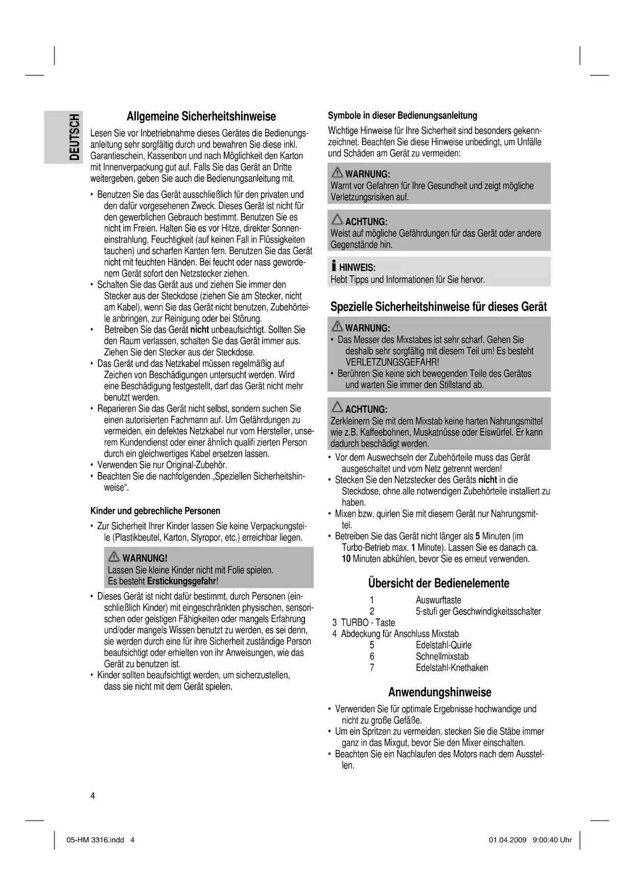 • Das Messer des Mixstabes ist sehr scharf. Gehen Sie