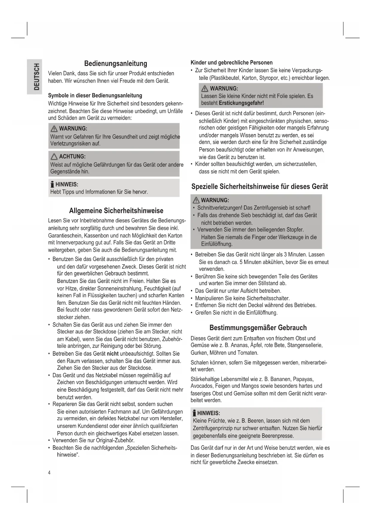 - Greifen Sie nicht in die Einfüllöffnung. Bestimmungsgemäßer Gebrauch Dieses Gerät dient zum Entsaften von frischem Obst und Gemüse wie z. B. Ananas, Äpfel, rote Bete, Stangensellerie, Gurken, Möhren und Tomaten. Schalen können, sofern Sie mitgegessen werden, mitverarbei- tet werden. Stärkehaltige Lebensmittel wie z. B. Bananen, Papayas, Avocados, Feigen und Mangos sowie besonders hartes und faseriges Obst und Gemüse sollten mit dem Gerät nicht verar- beitet werden. HINWEIS: Kleine Früchte, wie z. B. Beeren, lassen sich mit dem Zentrifugenprinzip nur schwer entsaften. Nutzen Sie hierfür gegebenenfalls eine geeignete Beerenpresse. Das Gerät darf nur in der Art und Weise benutzt werden, wie es in dieser Bedienungsanleitung beschrieben ist. Sie dürfen es nicht für gewerbliche Zwecke einsetzen.5 Jede andere Verwendung gilt als nicht bestimmungsgemäß und kann zu Sachschäden oder sogar zu Personenschäden führen. Der Hersteller übernimmt keine Haftung für Schäden, die durch nicht bestimmungsgemäßen Gebrauch entstehen. Lieferumfang 1 Basisgerät mit Motor 1 Transparente Abdeckung 1 Stopfer 1 Zentrifugensieb 1 Zentrifugengehäuse 1 Tresterbehälter Auspacken des Gerätes