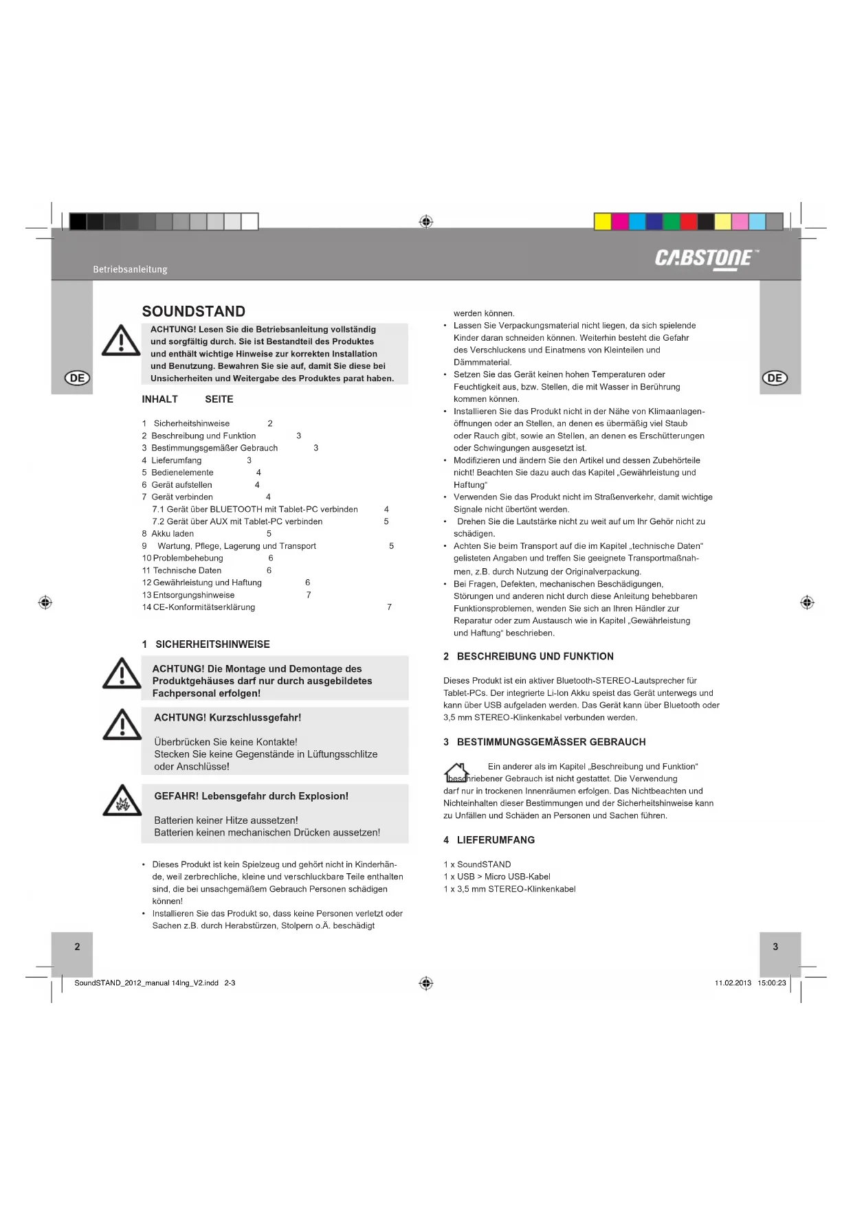 EinandereralsimKapitel„BeschreibungundFunktion“ beschriebener Gebrauch ist nicht gestattet. Die Verwendung darf nur in trockenen Innenräumen erfolgen. Das Nichtbeachten und Nichteinhalten dieser Bestimmungen und der Sicherheitshinweise kann zu Unfällen und Schäden an Personen und Sachen führen. 4 LIEFERUMFANG 1 x SoundSTAND 1 x USB > Micro USB-Kabel 1 x 3,5 mm STEREO-Klinkenkabel 1 SICHERHEITSHINWEISE ACHTUNG! Die Montage und Demontage des Produktgehäuses darf nur durch ausgebildetes Fachpersonal erfolgen!