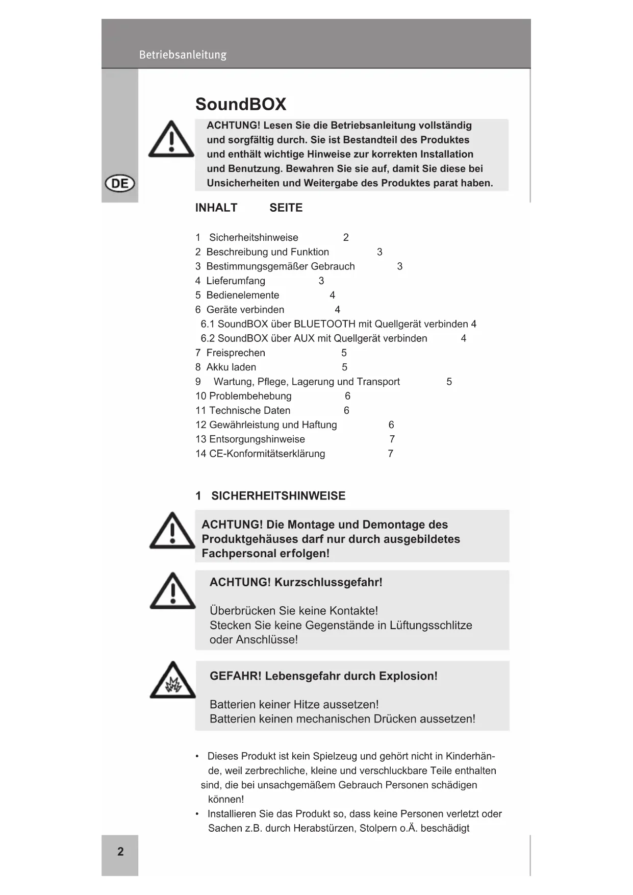 RU Руководство пользователя ZH 手册 KO 매뉴얼2 Betriebsanleitung ACHTUNG! Lesen Sie die Betriebsanleitung vollständig und sorgfältig durch. Sie ist Bestandteil des Produktes und enthält wichtige Hinweise zur korrekten Installation und Benutzung. Bewahren Sie sie auf, damit Sie diese bei Unsicherheiten und Weitergabe des Produktes parat haben. SoundBOX INHALT SEITE 1 Sicherheitshinweise 2 2 Beschreibung und Funktion 3 3 Bestimmungsgemäßer Gebrauch 3 4 Lieferumfang 3 5 Bedienelemente 4 6 Geräte verbinden 4