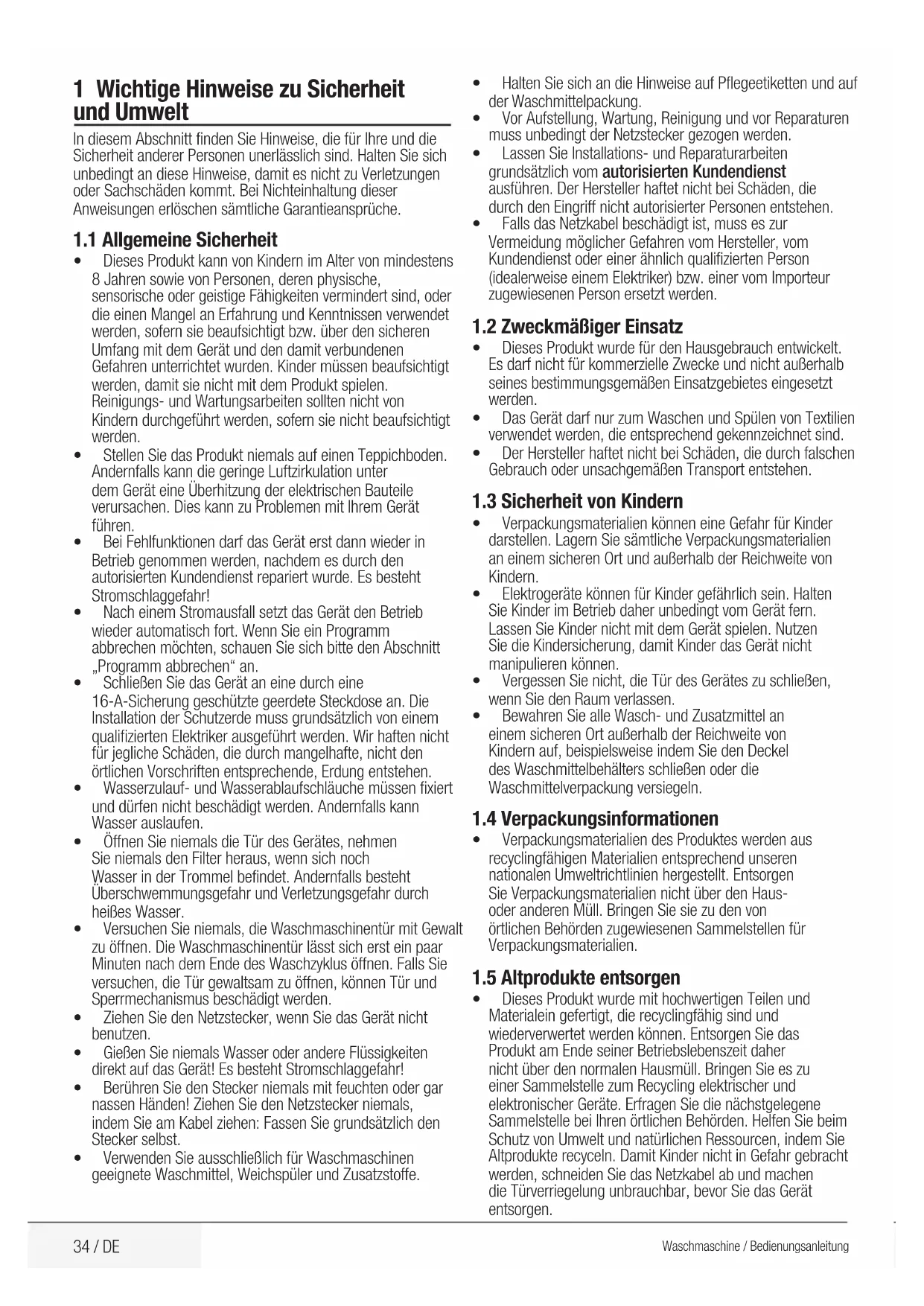 Document Number34 / DE Waschmaschine / Bedienungsanleitung 1 Wichtige Hinweise zu Sicherheit