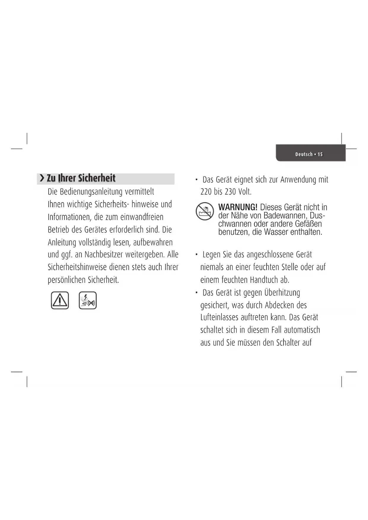 WARNING! Dieses Gerät nicht in der Nähe von Badewannen, Duschwannen oder andere Gefäßen benutzen, die Wasser enthalten.