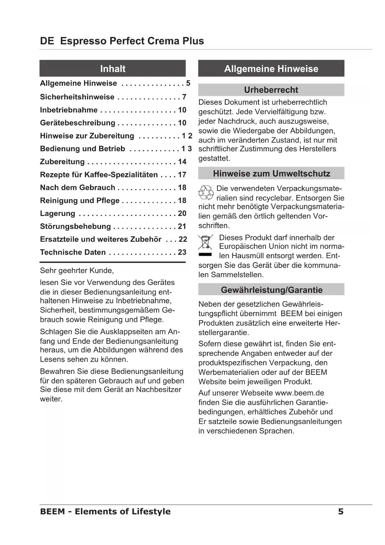 Finden Sie kostenlos die Bedienungsanleitung des Geräts Espresso Perfect Crema Plus BEEM als PDF.