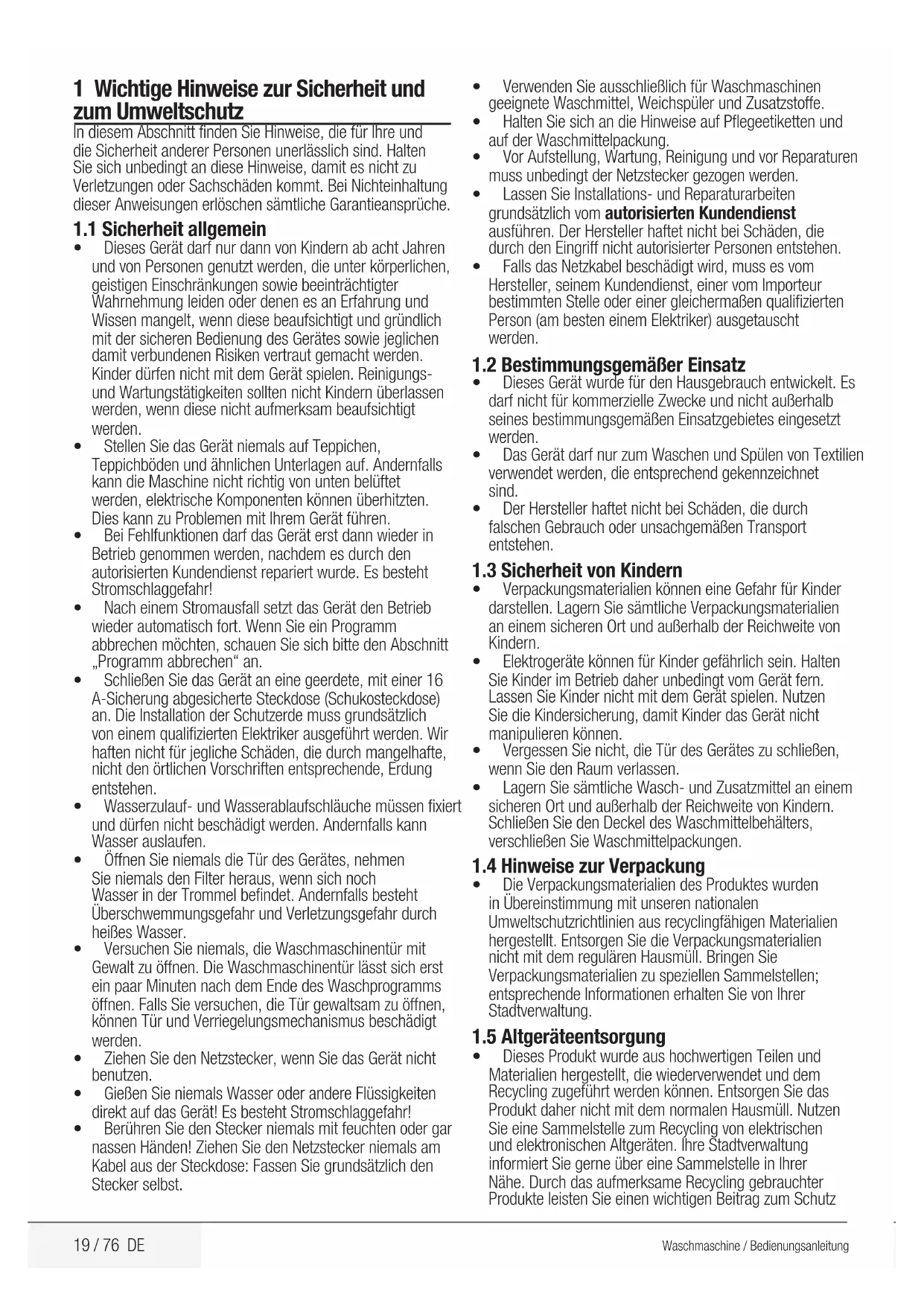 Dokument Nummer19/76DE Waschmaschine / Bedienungsanleitung 1 Wichtige Hinweise zur Sicherheit und