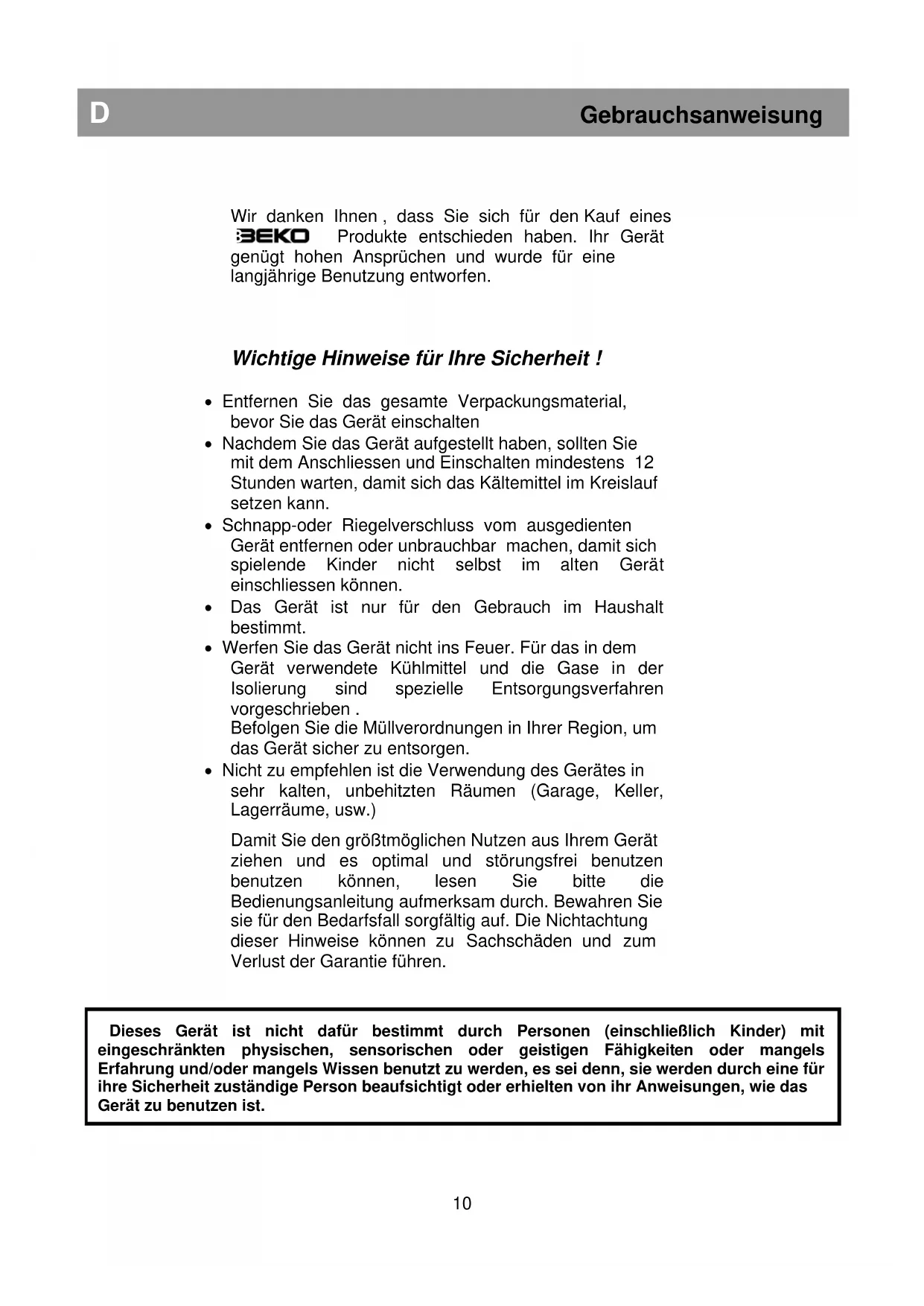 Wichtige Hinweise für Ihre Sicherheit /10 Elektrischer Anschluss /11 Transporthinweise /11 Aufstellung des Gerätes /11 Geräteübersicht /12 Allgemeine Einlagerungsempfehlungen /12 Temperaturregelung. Einstellung der Temperatur /13 Bevor der Inbetriebnahme /13 Lagern von tiefgefrorenen Lebensmitteln /13 Einfrieren von frischen Lebensmitteln /13 Abtauen des Gerätes /14 Wechseln des türanschlags /14 Wechsel der Glühlampe /14 Reinigung und Pflege /15 Was Sie tun sollten und was auf keinen fall-einige Hinweise /16 Energieverbrauch /17 Hinweise zu Geräuschen und Vibrationen /17 Massnahmen bei Betriebstőrunger /18 Technische Daten /18