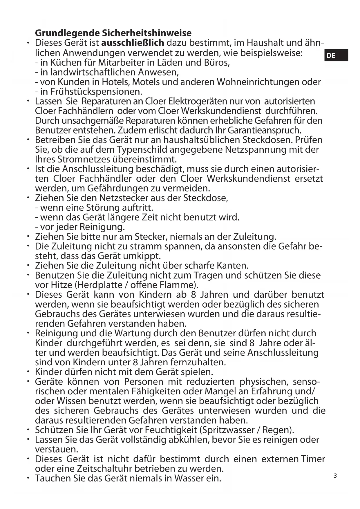 Grundlegende Sicherheitshinweise Dieses Gerät ist ausschließlich dazu bestimmt, im Haushalt und ähn- lichen Anwendungen verwendet zu werden, wie beispielsweise: - in Küchen für Mitarbeiter in Läden und Büros, - in landwirtschaftlichen Anwesen, - von Kunden in Hotels, Motels und anderen Wohneinrichtungen oder - in Frühstückspensionen. Lassen Sie Reparaturen an Cloer Elektrogeräten nur von autorisierten Cloer Fachhändlern oder vom Cloer Werkskundendienst durchführen. Durch unsachgemäße Reparaturen können erhebliche Gefahren für den Benutzer entstehen. Zudem erlischt dadurch Ihr Garantieanspruch. Betreiben Sie das Gerät nur an haushaltsüblichen Steckdosen. Prüfen Sie, ob die auf dem Typenschild angegebene Netzspannung mit der Ihres Stromnetzes übereinstimmt. Ist die Anschlussleitung beschädigt, muss sie durch einen autorisier- ten Cloer Fachhändler oder den Cloer Werkskundendienst ersetzt werden, um Gefährdungen zu vermeiden. Ziehen Sie den Netzstecker aus der Steckdose, - wenn eine Störung auftritt. - wenn das Gerät längere Zeit nicht benutzt wird. - vor jeder Reinigung. Ziehen Sie bitte nur am Stecker, niemals an der Zuleitung. Die Zuleitung nicht zu stramm spannen, da ansonsten die Gefahr be- steht, dass das Gerät umkippt. Ziehen Sie die Zuleitung nicht über scharfe Kanten. Benutzen Sie die Zuleitung nicht zum Tragen und schützen Sie diese vor Hitze (Herdplatte / offene Flamme). Dieses Gerät kann von Kindern ab 8 Jahren und darüber benutzt werden, wenn sie beaufsichtigt werden oder bezüglich des sicheren Gebrauchs des Gerätes unterwiesen wurden und die daraus resultie- renden Gefahren verstanden haben. Reinigung und die Wartung durch den Benutzer dürfen nicht durch Kinder durchgeführt werden, es sei denn, sie sind 8 Jahre oder äl- ter und werden beaufsichtigt. Das Gerät und seine Anschlussleitung sind von Kindern unter 8 Jahren fernzuhalten. Kinder dürfen nicht mit dem Gerät spielen. Geräte können von Personen mit reduzierten physischen, senso- rischen oder mentalen Fähigkeiten oder Mangel an Erfahrung und/ oder Wissen benutzt werden, wenn sie beaufsichtigt oder bezüglich des sicheren Gebrauchs des Gerätes unterwiesen wurden und die daraus resultierenden Gefahren verstanden haben. Schützen Sie Ihr Gerät vor Feuchtigkeit (Spritzwasser / Regen). Lassen Sie das Gerät vollständig abkühlen, bevor Sie es reinigen oder verstauen. Dieses Gerät ist nicht dafür bestimmt durch einen externen Timer oder eine Zeitschaltuhr betrieben zu werden. Tauchen Sie das Gerät niemals in Wasser ein.