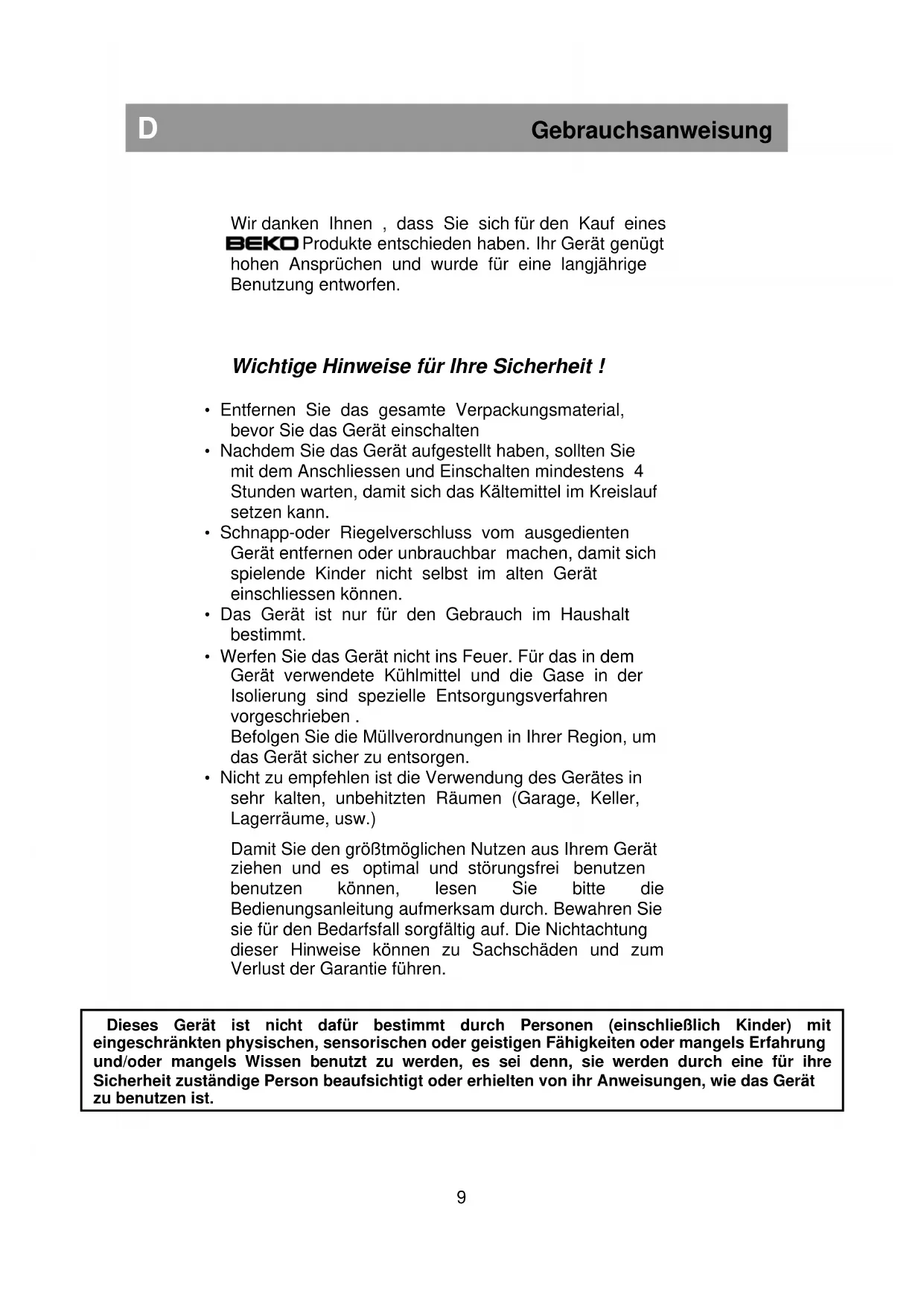 Wichtige Hinweise für Ihre Sicherheit /9 Elektrischer Anschluss /10 Transporthinweise /10 Aufstellen /10 Geräteübersicht /11 Allgemeine Einlagerungsempfehlungen /11 Temperaturkontrolle und –einstellung /11 Bevor der Inbetriebnahme /12 Lagern von tiefgefrorenen Lebensmitteln /12 Einfrieren von frischen Lebensmitteln /12 Abtauen des Gerätes /13 Wechseln des türanschlags /13 Wechsel der Glühlampe /13 Reinigung und Pflege /14 Was Sie tun sollten und was auf keinen fall-einige Hinweise /15 Massnahmen bei Betriebstırunger /16 Technische Daten /16