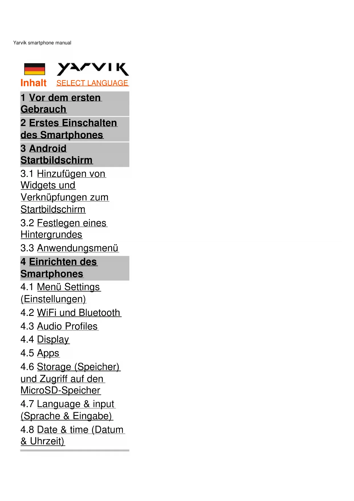 - Setzen Sie das SmartphoneYarvik smartphone manual file:///Users/elroy/Desktop/Yarvik/Manual/manual_de.html[08-10-13 11:23:10] nicht für einen längeren Zeitraum starker Sonneneinstrahlung aus.