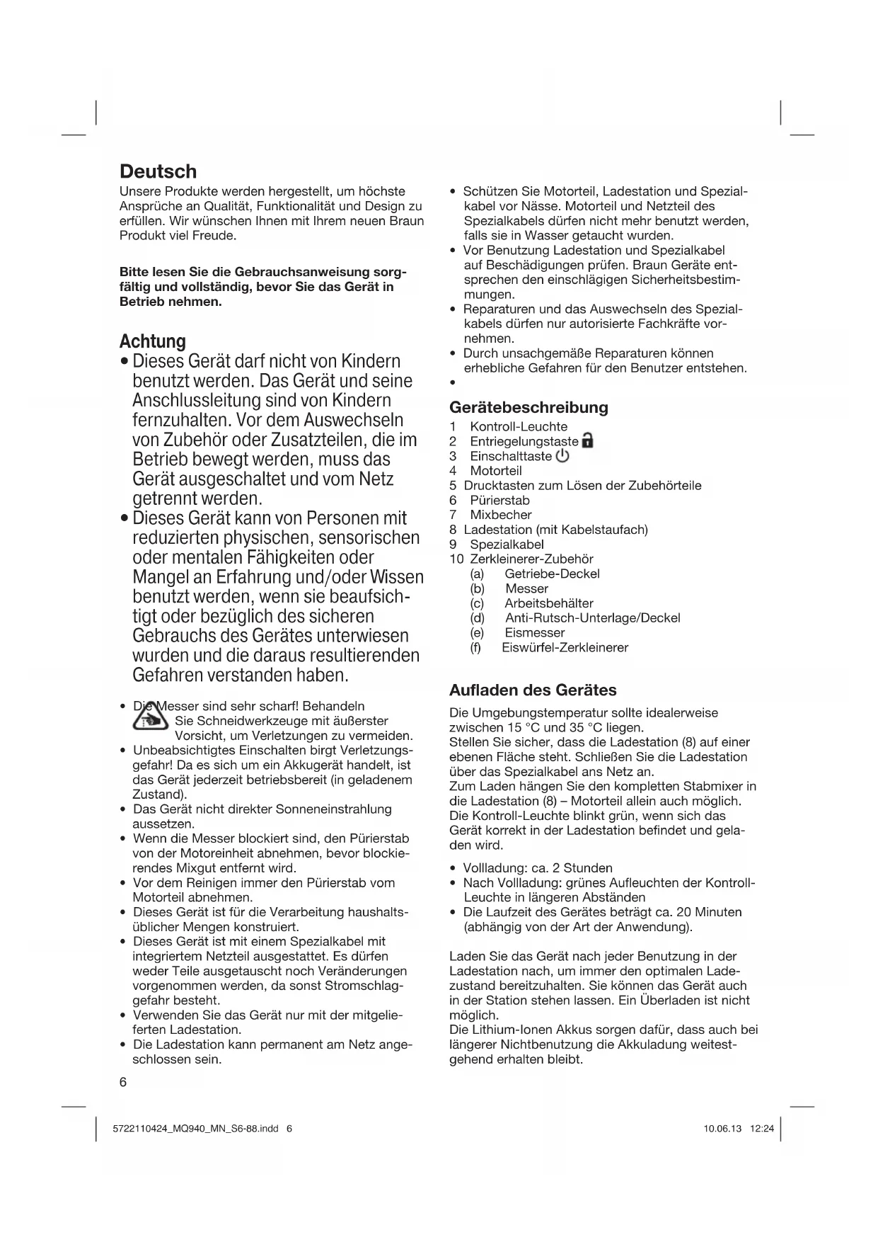 servierende Getränk direkt in den Arbeitsbehälter füllen. Alternativ können Sie zunächst Früchte mit dem Messer (10b) im Arbeitsbehälter zerkleinern (bis max. 0,5 l). Nehmen Sie dann das Messer (10b) heraus und setzen Sie den Eiswürfel-Zerkleinerer (10f) und das Eismesser (10e) ein. So können Sie dann Eiswürfel direkt in die pürierten Früchte zerkleinern. Reinigung Vor jedem Reinigen das Motorteil abnehmen. Motorteil (4) und Ladestation (8) weder in Wasser tauchen noch unter fließendes Wasser halten. Diese Teile können mit einem feuchten Tuch abgewischt werden. Vor dem Reinigen der Ladestation das Spezialkabel vom Netz trennen. Das Getriebeteil des Zerkleinerers (10a) ist nicht spülmaschinengeeignet. Alle anderen Teile sind spülmaschinengeeignet. Bei farbstoffreichen Gütern (z.B. Karotten) können die Kunststoffteile beschlagen oder sich verfärben. Wischen Sie diese Teile mit Speiseöl ab, bevor Sie sie in die Spülmaschine geben. Elektrische Angaben siehe Bedruckung auf dem Spezialkabel. Das Spezialkabel sorgt für eine automatische Spannungsanpassung zwischen 100 und 240 Volt. Änderungen vorbehalten. Dieses Gerät enthält Li-Ionen Akkus. Es darf am Ende seiner Lebensdauer nicht mit dem Hausmüll entsorgt werden. Die Entsorgung kann über den Braun Kundendienst oder lokal verfügbare Rückgabe- und Sammelsysteme erfolgen. 5722110424_MQ940_MN_S6-88.indd 85722110424_MQ940_MN_S6-88.indd 8 10.06.13 12:2410.06.13 12:249 English Our products are engineered to meet the highest standards of quality, functionality and design. We hope that you thoroughly enjoy your new Braun appliance. Please read the use instructions carefully and completely before using the appliance. Caution